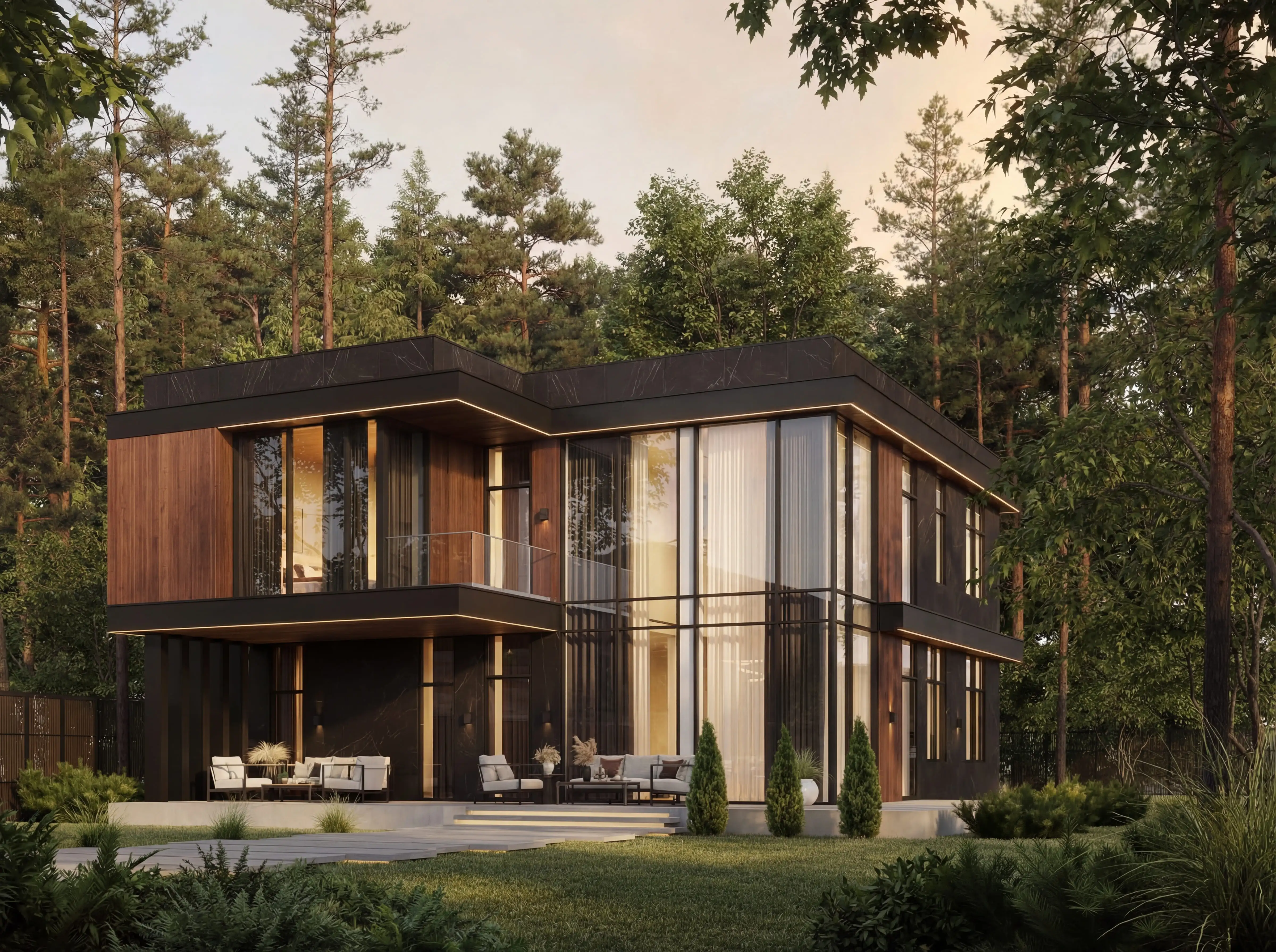 Завершены фундамент, дом, крыша. Проект включает просторные террасы и панорамные окна, создающие ощущение открытости и единения с природой.