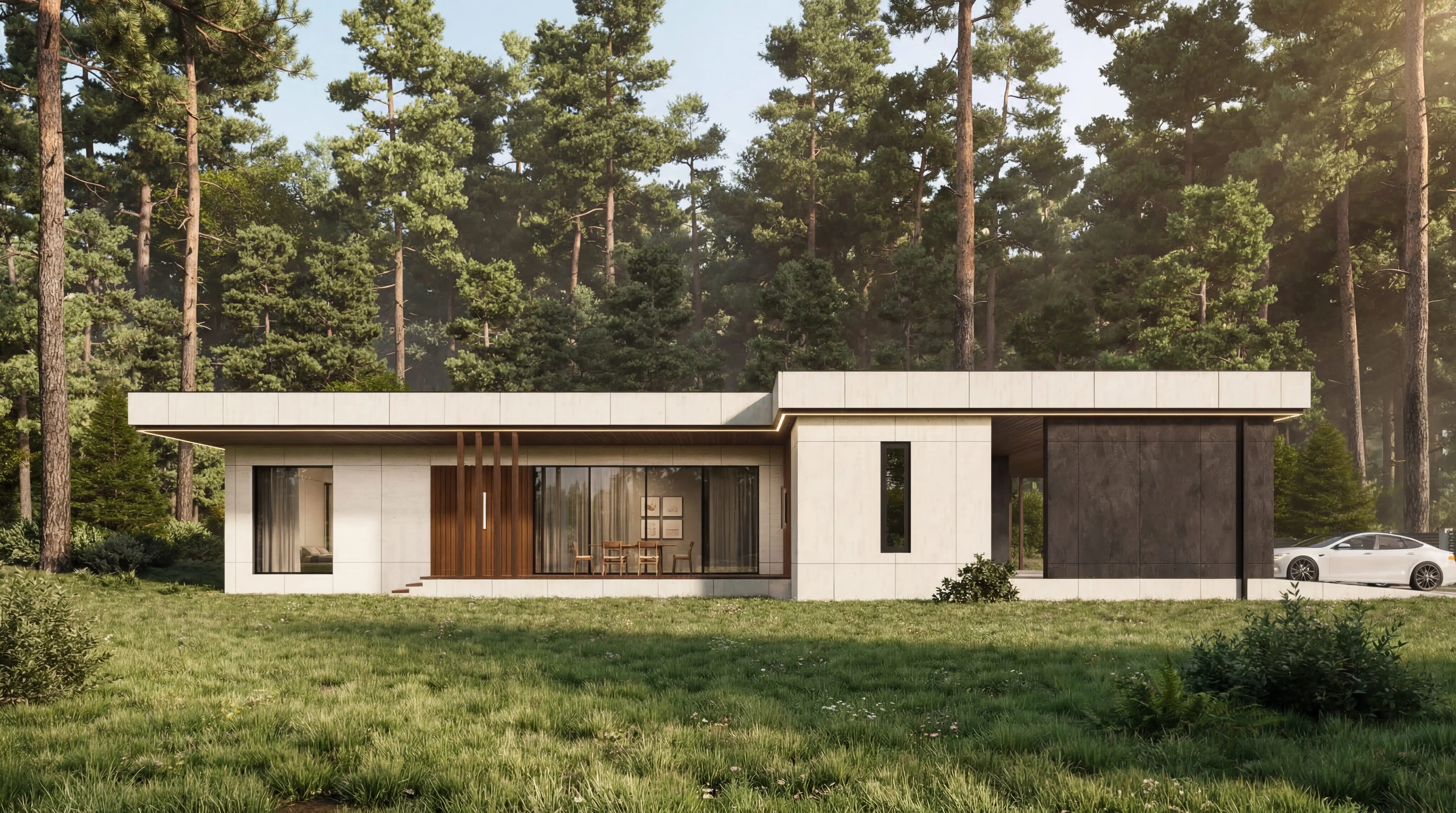 Хай-тек 3 – дом для небольшой семьи с возможностью размещения гостей. Сердцем проекта является просторная кухня-гостиная, продолжающаяся на террасе с открытым бассейном. Большая площадь остекления создаёт ощущение связи с окружающей средой.