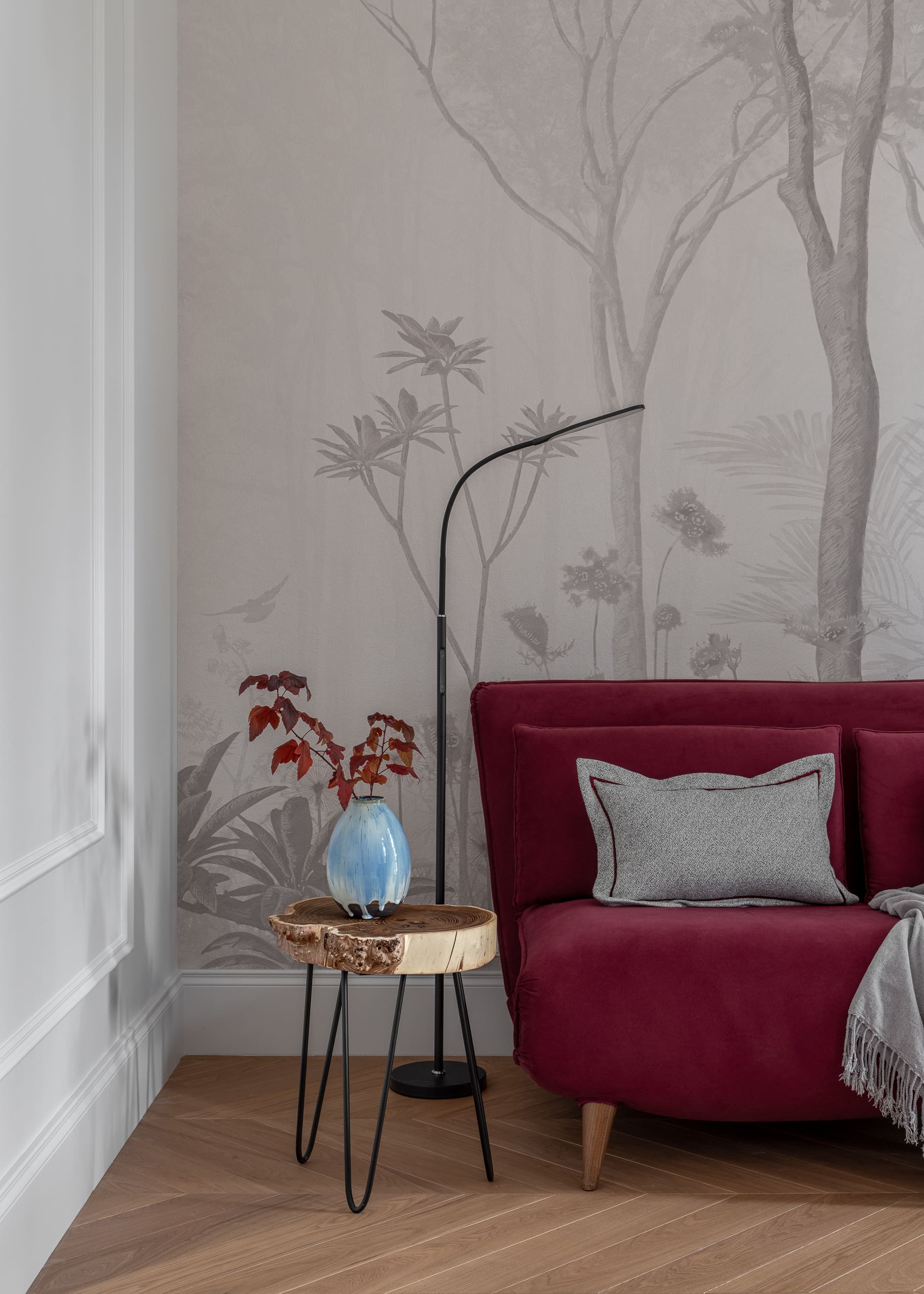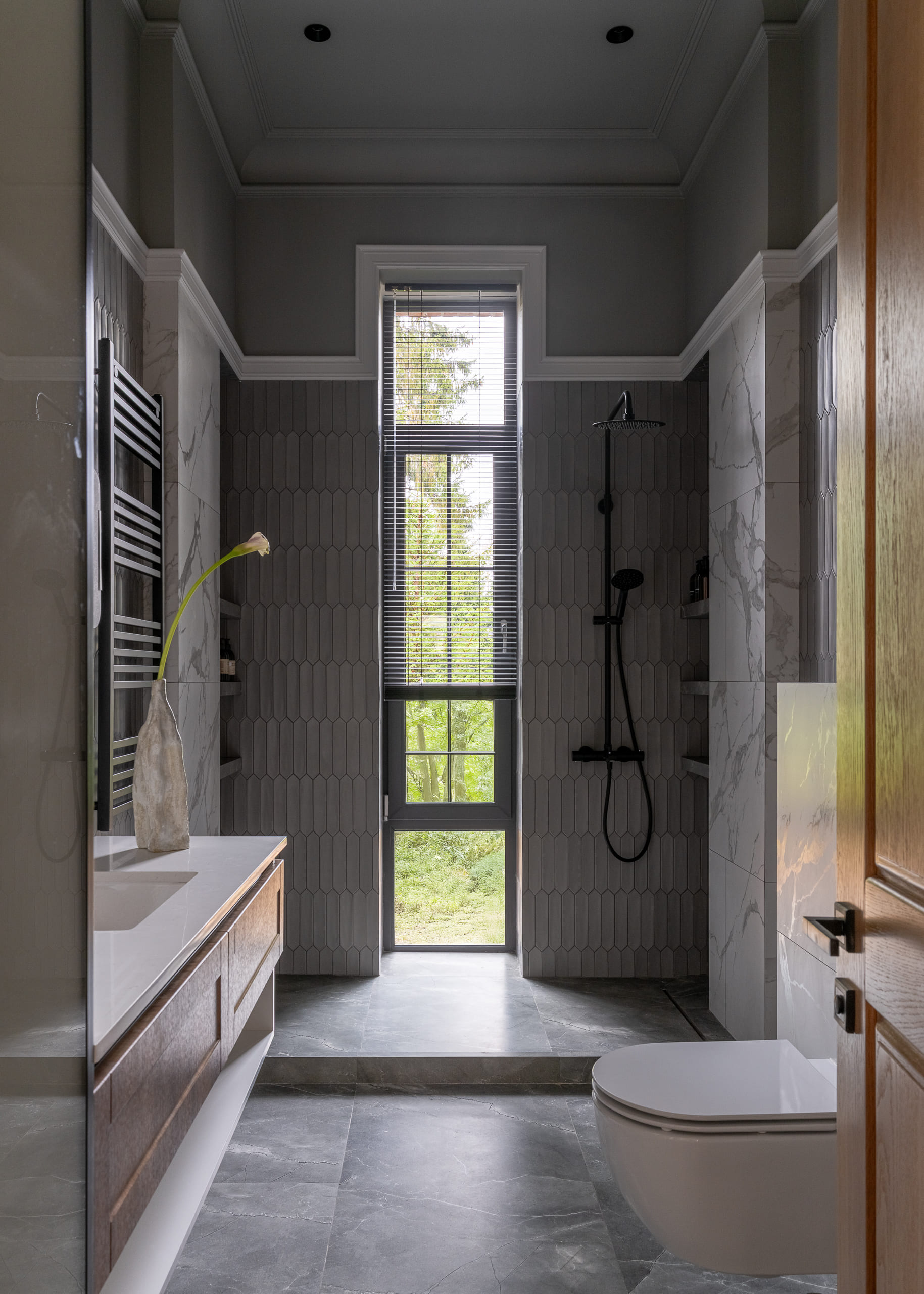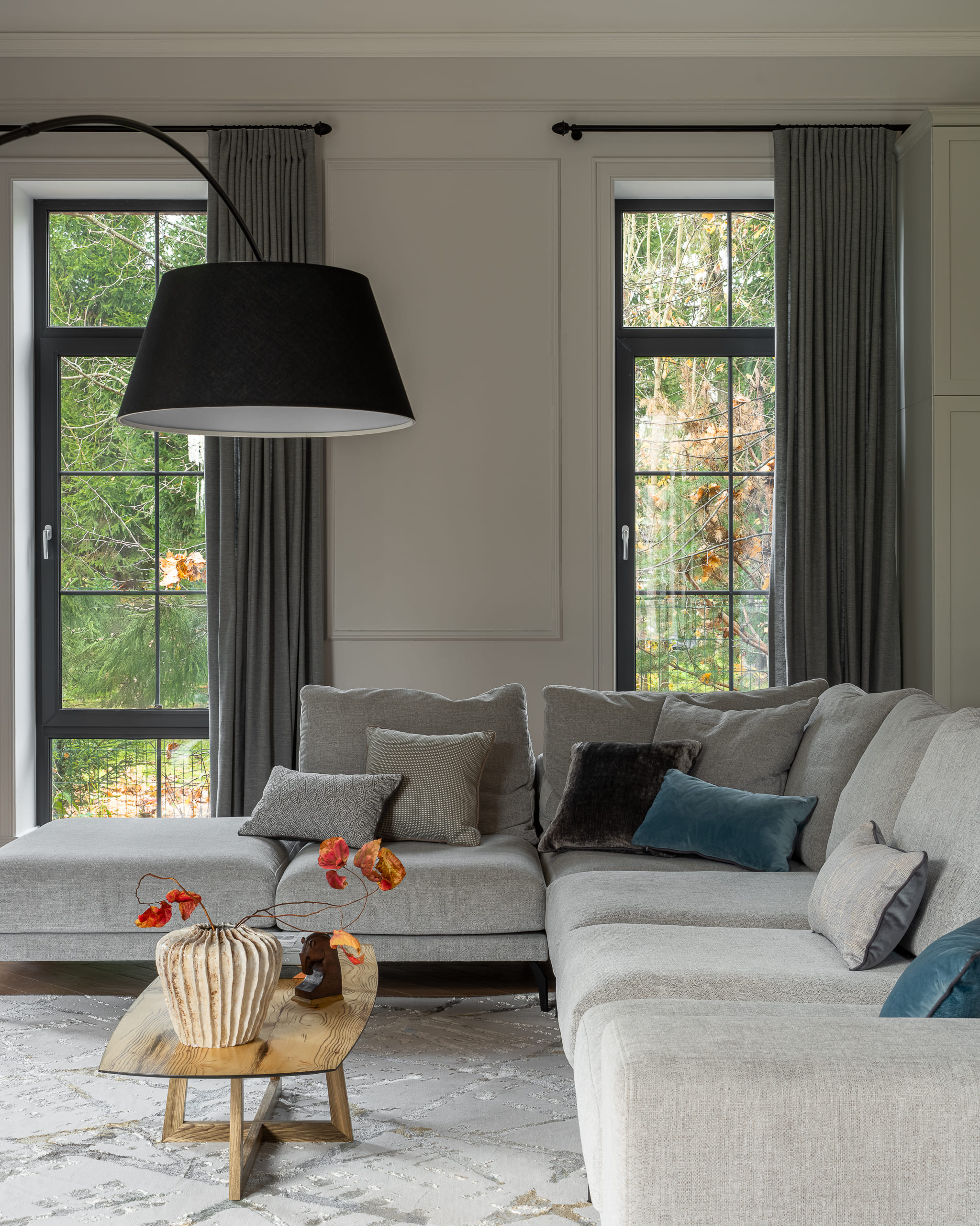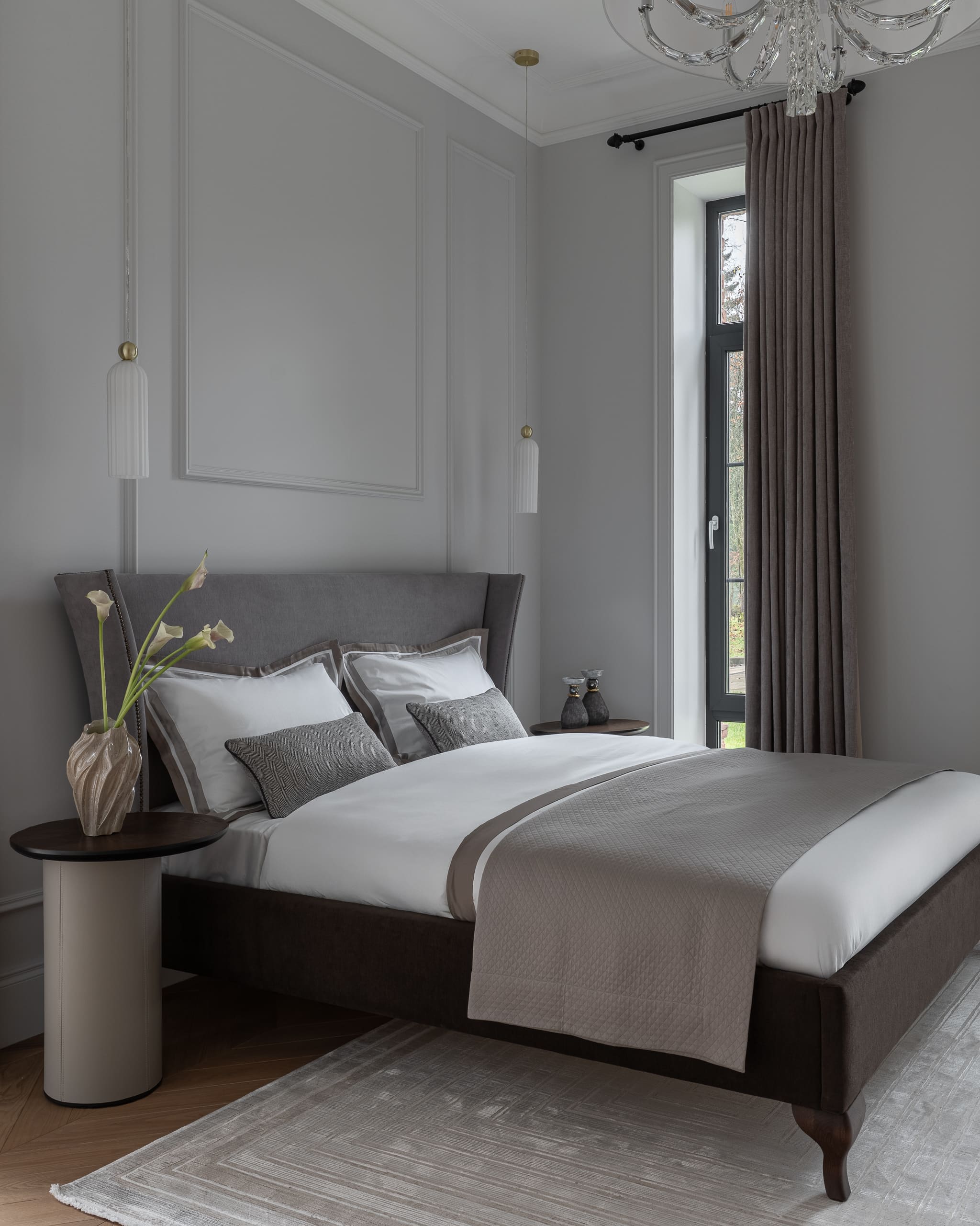 Цветовая палитра отделки варьируется от тёмно-коричневого до пастельных оттенков, создавая ощущение уединения и уюта.