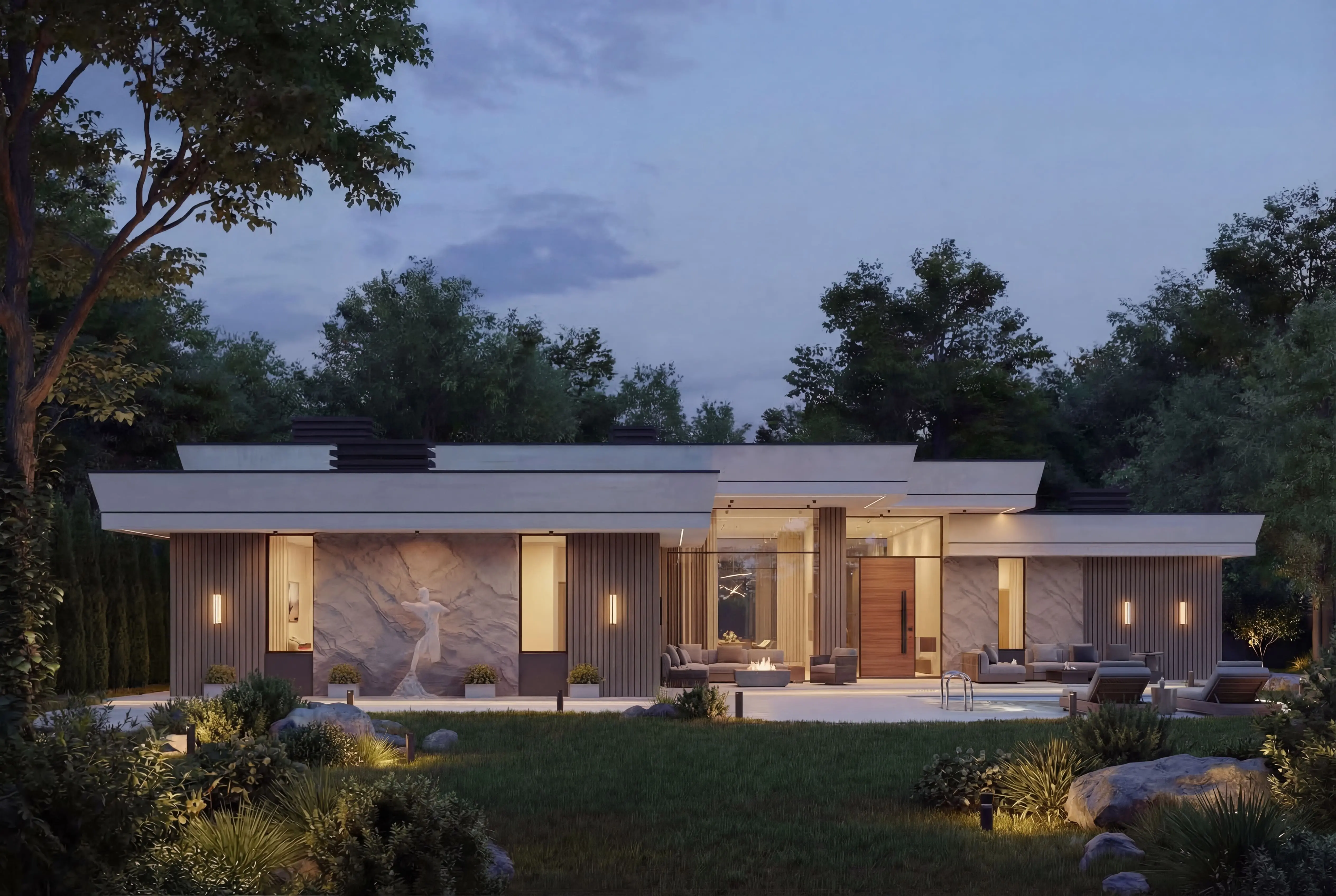 Зона BBQ (28.10 м²): Открытая зона для барбекю, идеальная для отдыха на свежем воздухе.