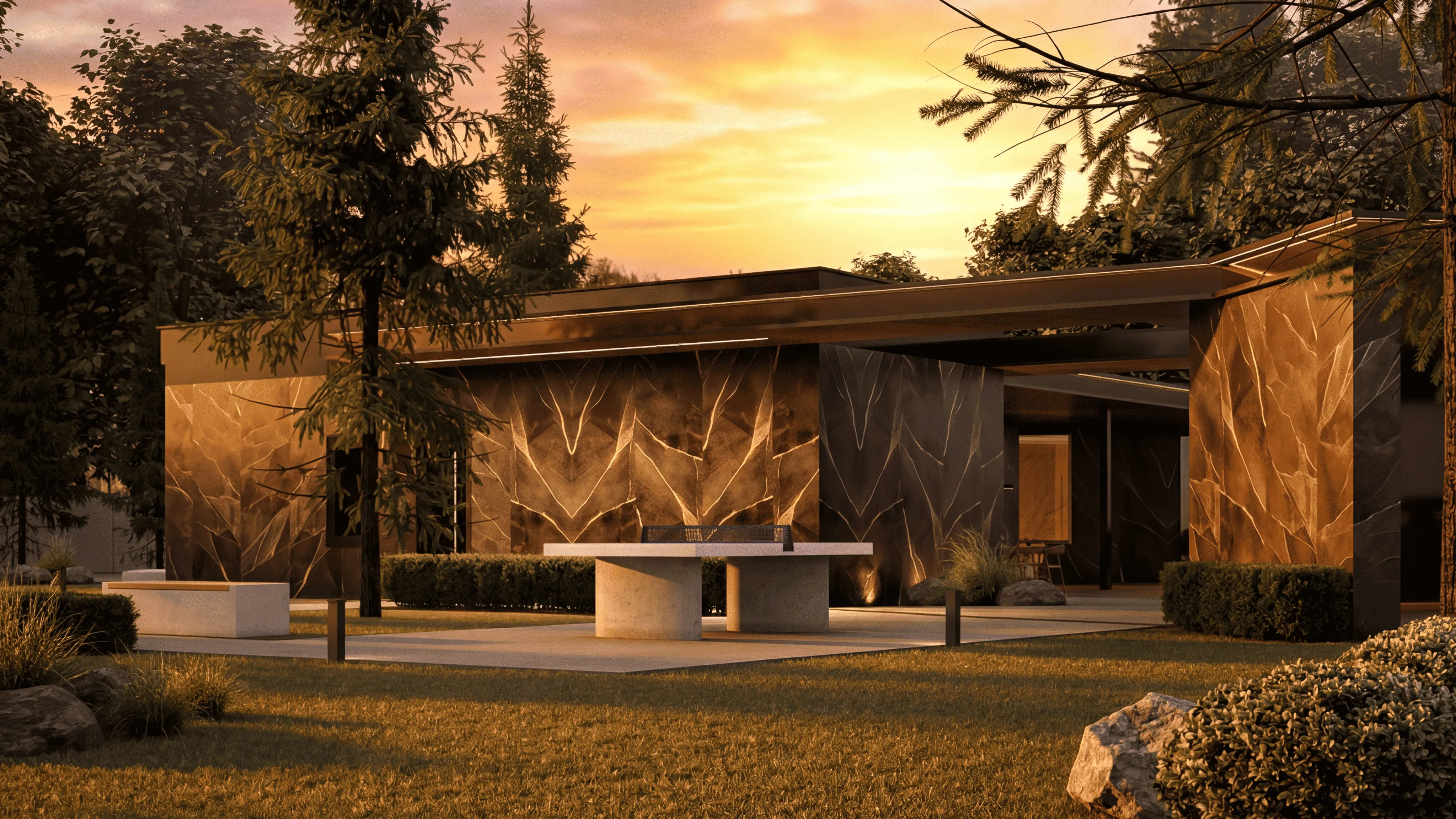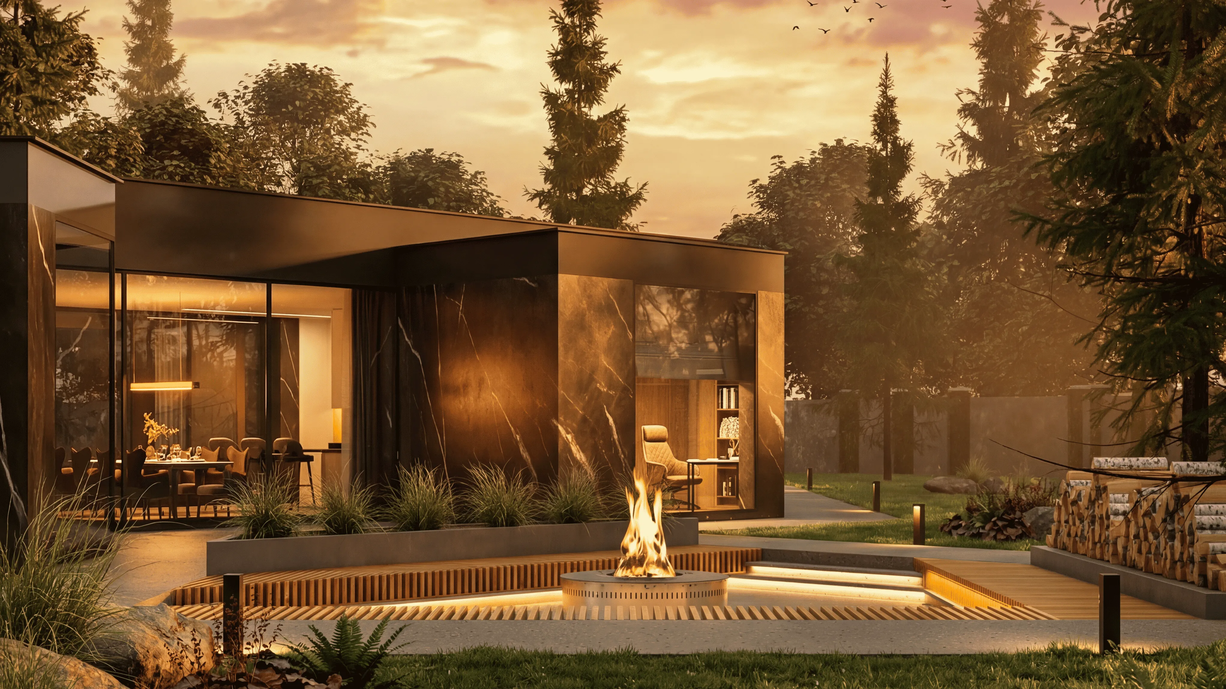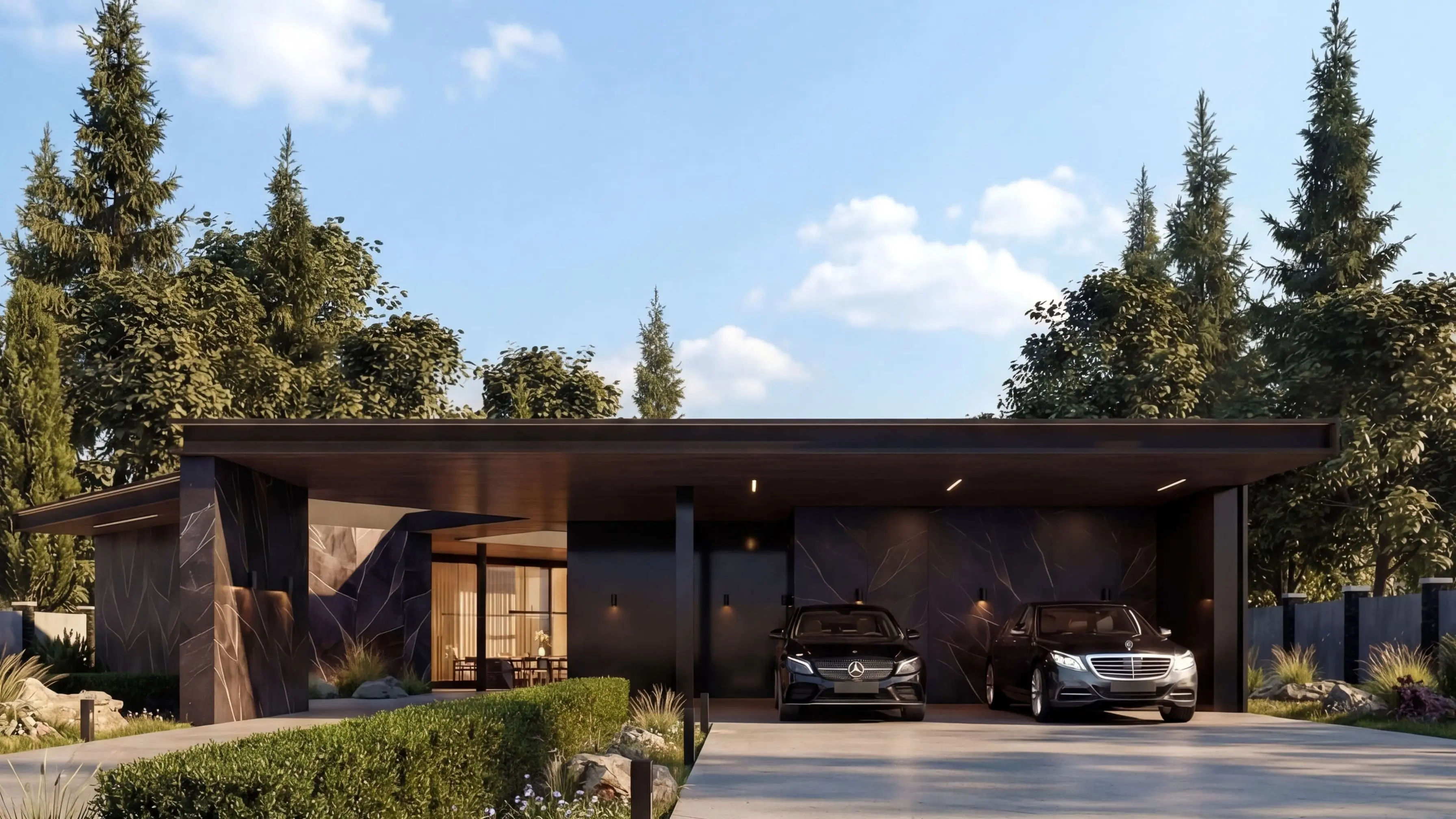 Внешние Стены: облицованы темным и светлым деревом, а также темным камнем или материалом под камень, создавая визуальный контраст и добавляя тепла.