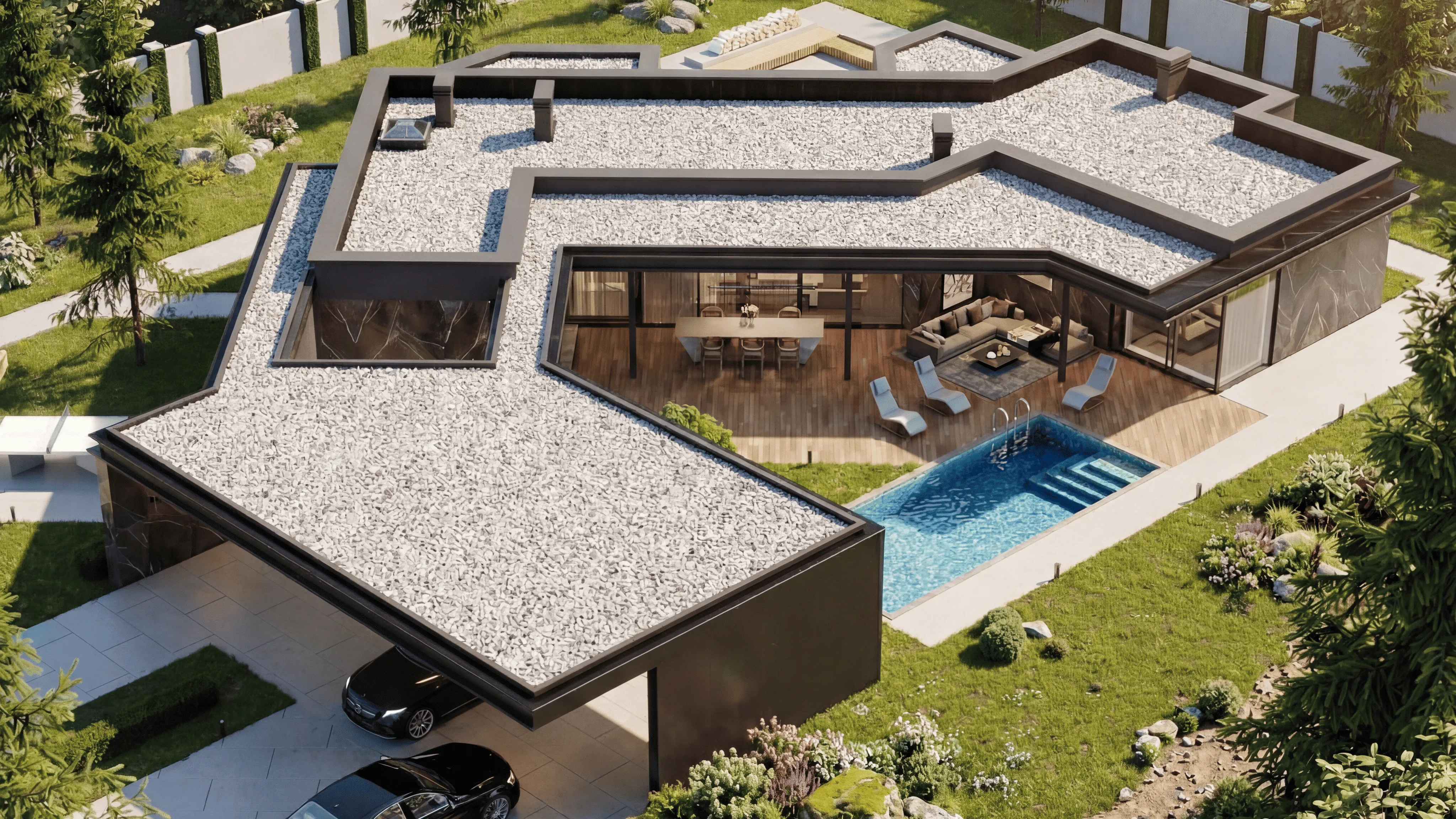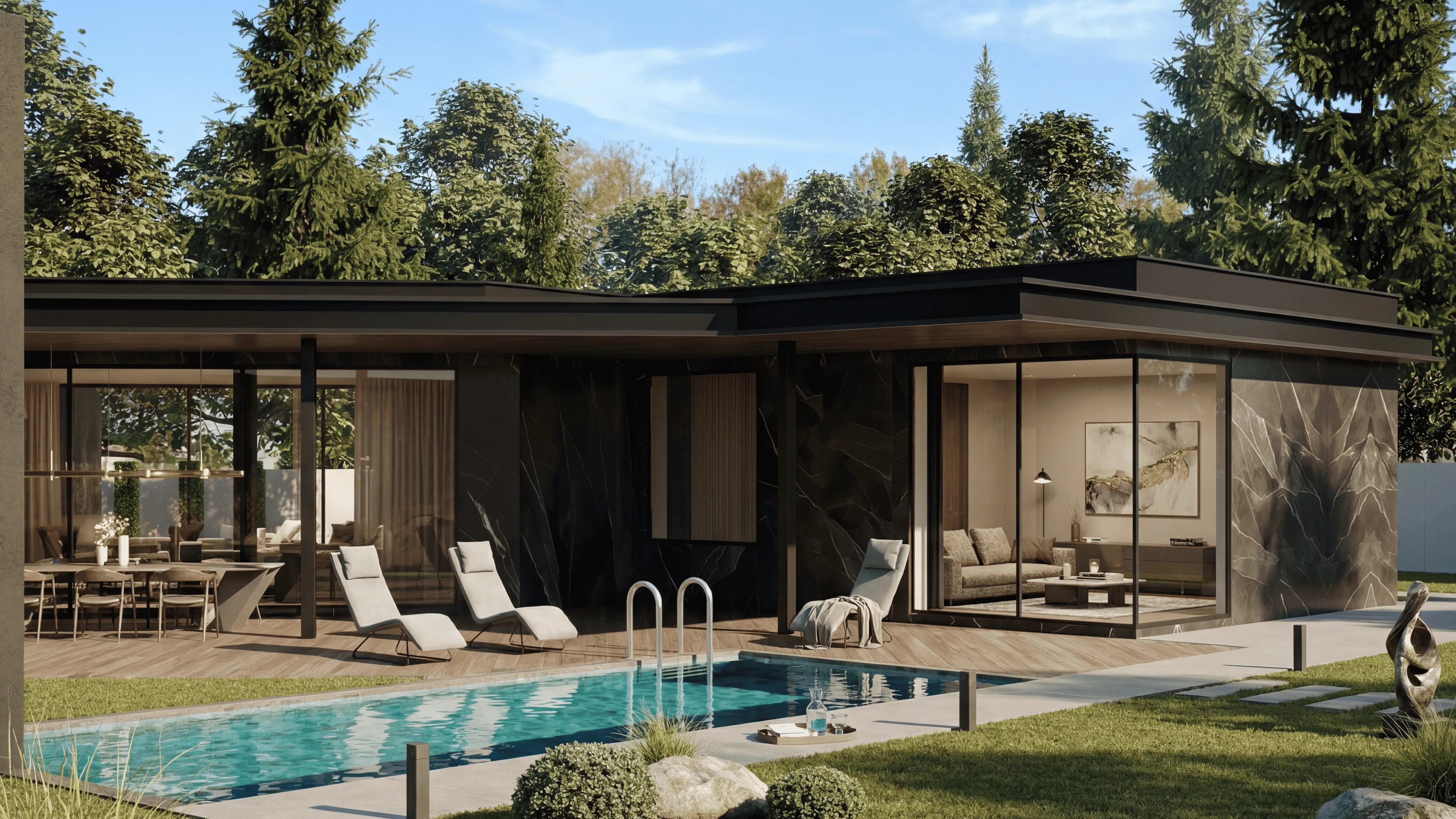 - На террасе расположена обеденная зона и углубленный бассейн, создающий ощущение уединения и комфорта на открытом воздухе.