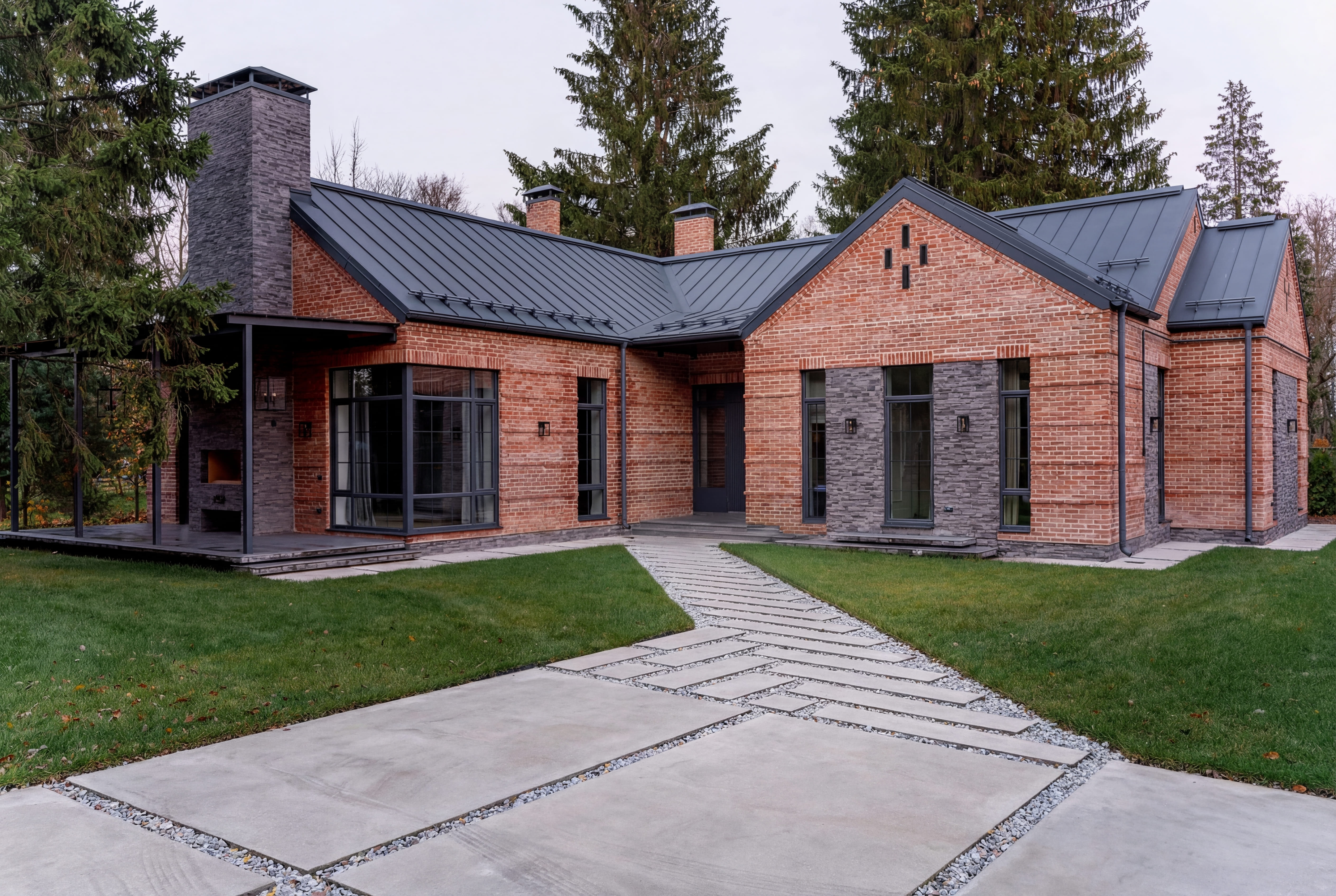 Современный загородный дом с выразительным фасадом из кирпича ручной формовки, подчёркнутым цоколем из искусственного камня. Терраса отделана ДПК под дерево, а клееные балки крыши добавляют архитектурной выразительности. Расположенный на неровном ландшафте, дом органично вписывается в природу, сочетая традиционные материалы с современными решениями для комфортной загородной жизни.
