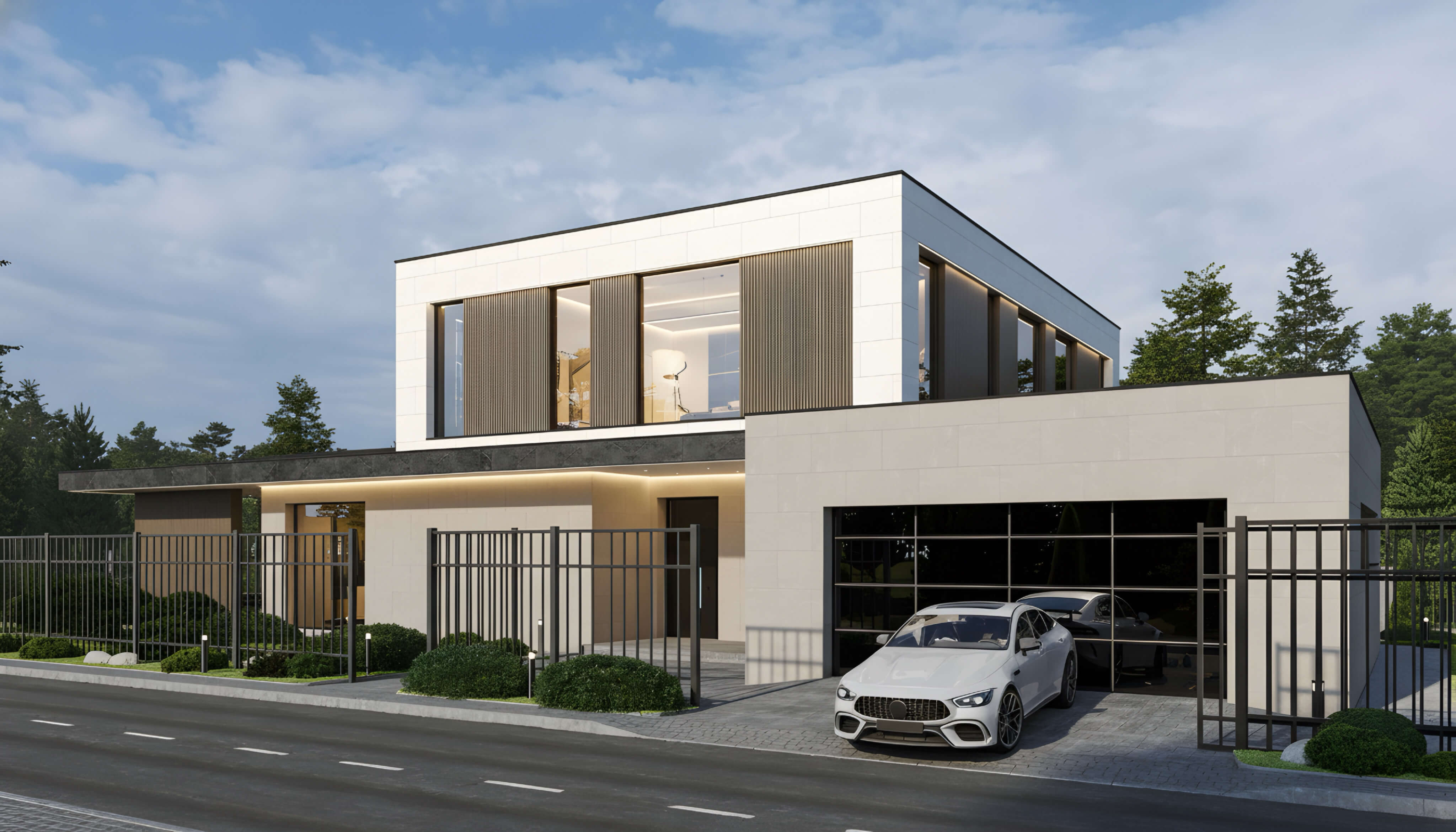 Хай-тек 3 – дом для небольшой семьи с возможностью размещения гостей. Сердцем проекта является просторная кухня-гостиная, продолжающаяся на террасе с открытым бассейном. Большая площадь остекления создаёт ощущение связи с окружающей средой.