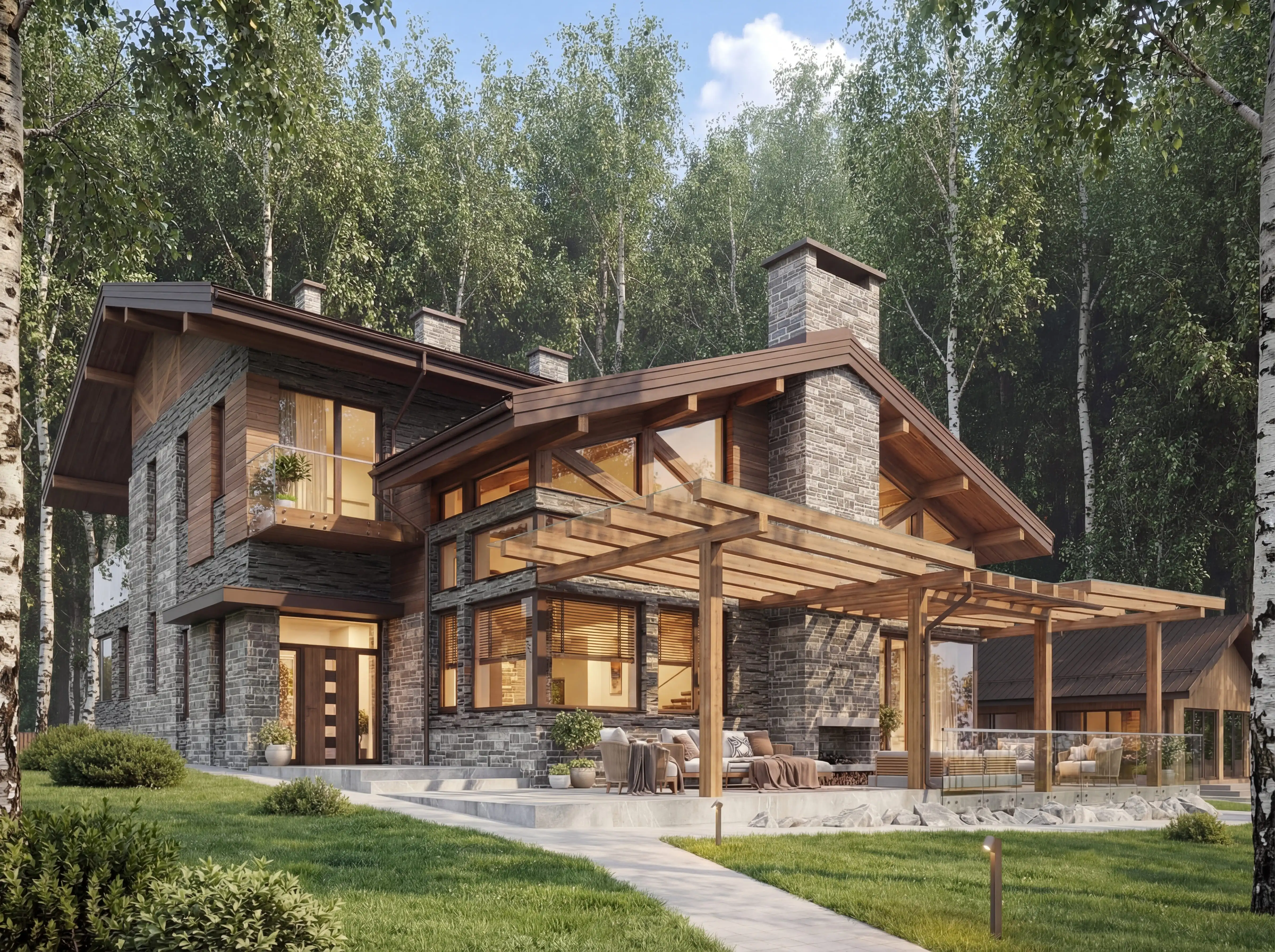 Современное строительство коттеджей в стиле Шале стало модным трендом и прекрасным способом гармонично интегрировать современное жилище в природу. Шале представляет собой симбиоз городских удобств и деревенского уюта деревянной постройки.