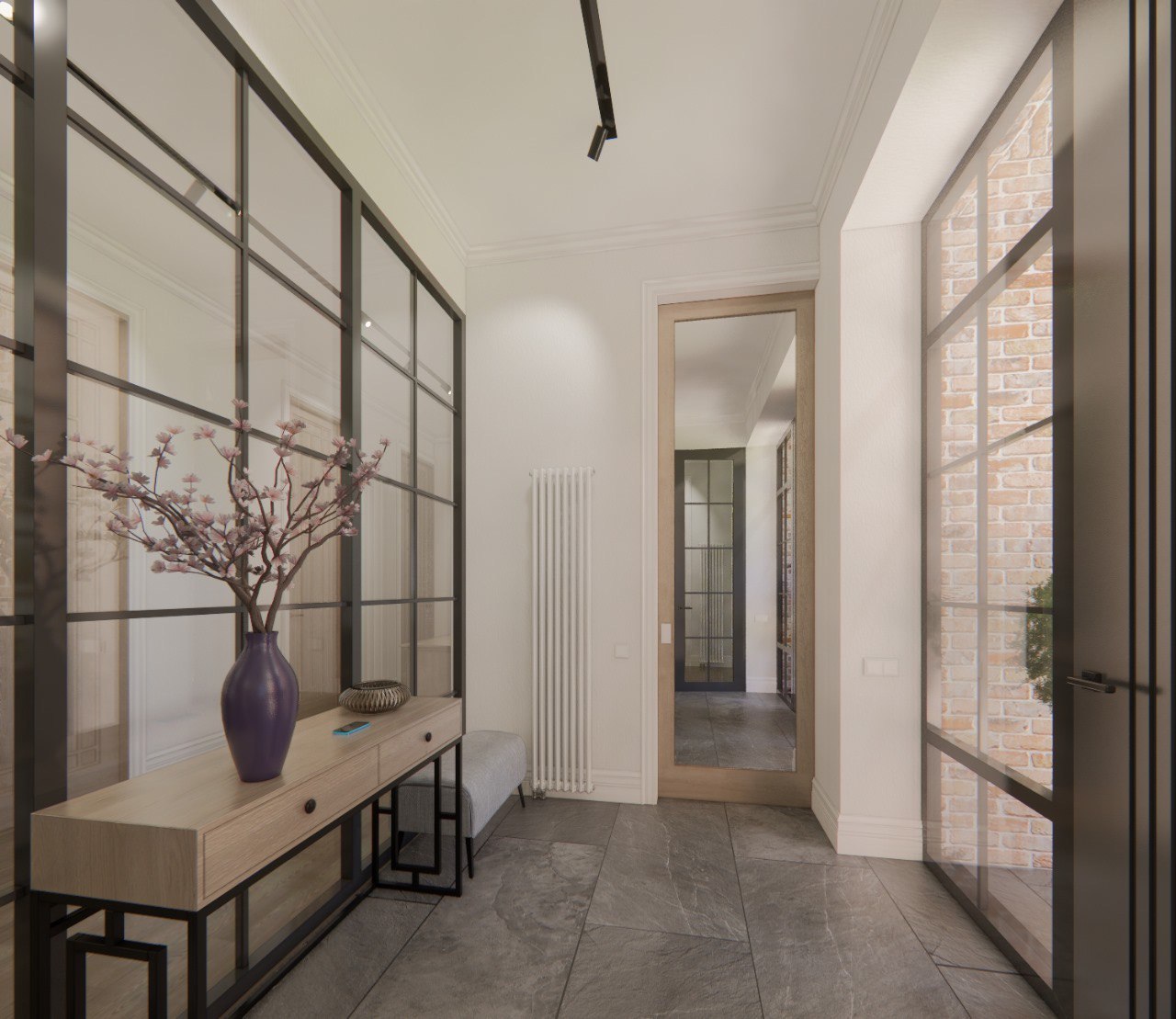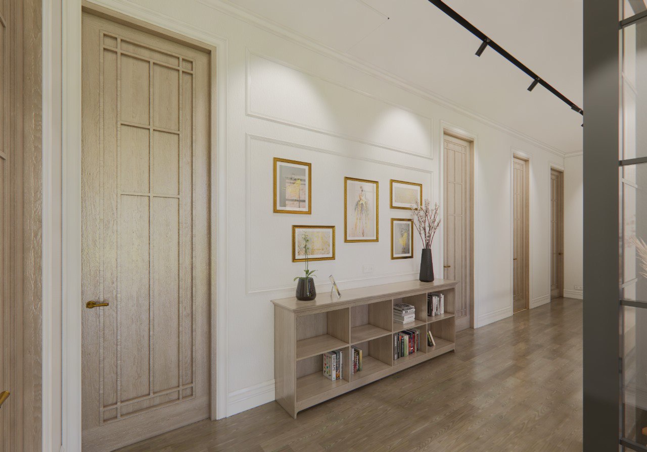 В конце холла находится ещё одна гардеробная 6.68 м² с небольшим окном, укомплектованная для удобного хранения вещей.