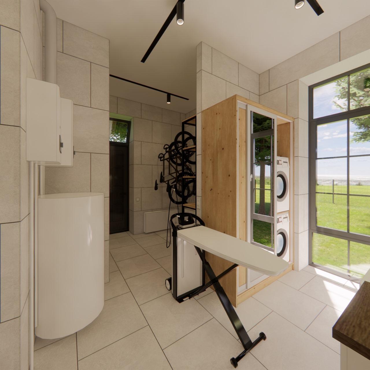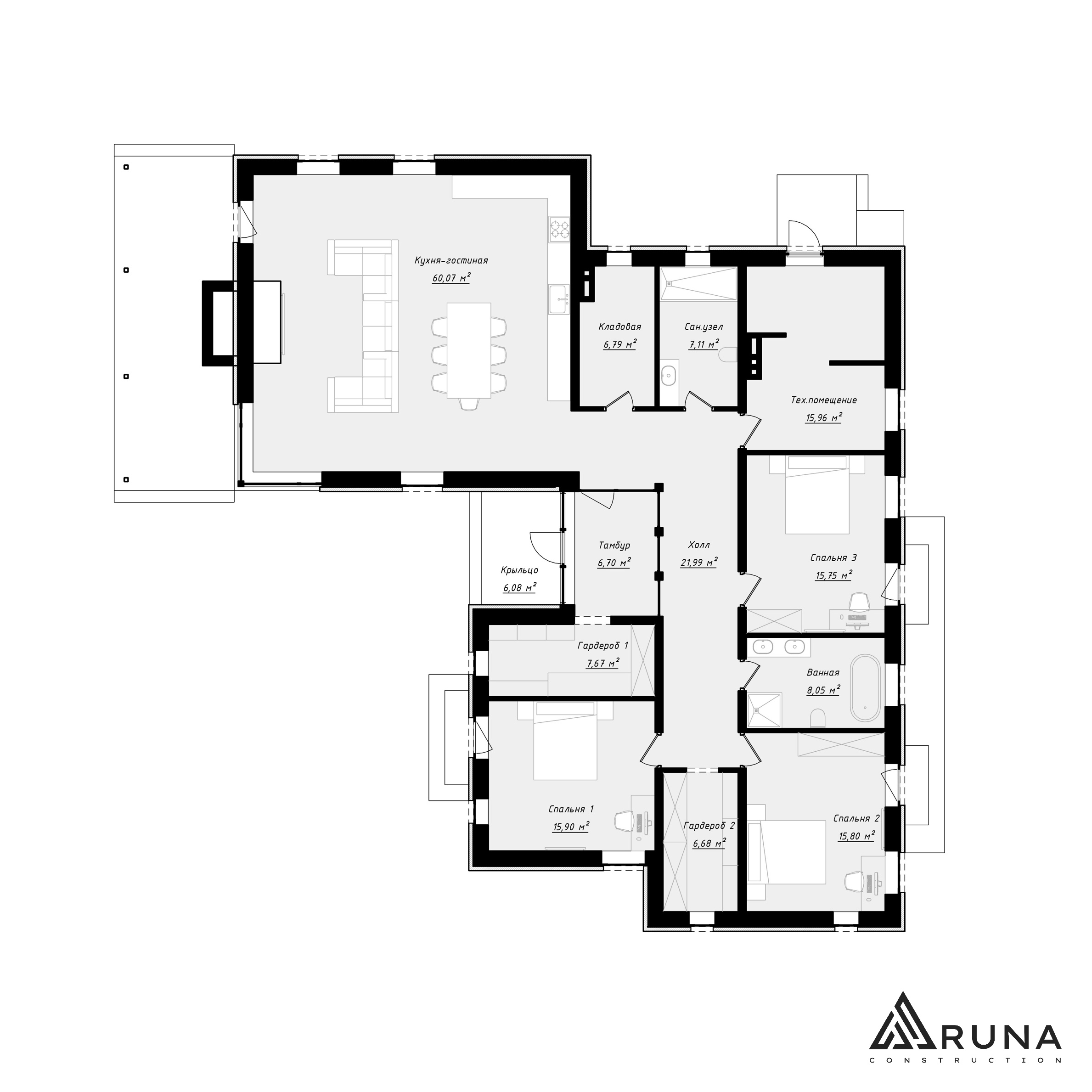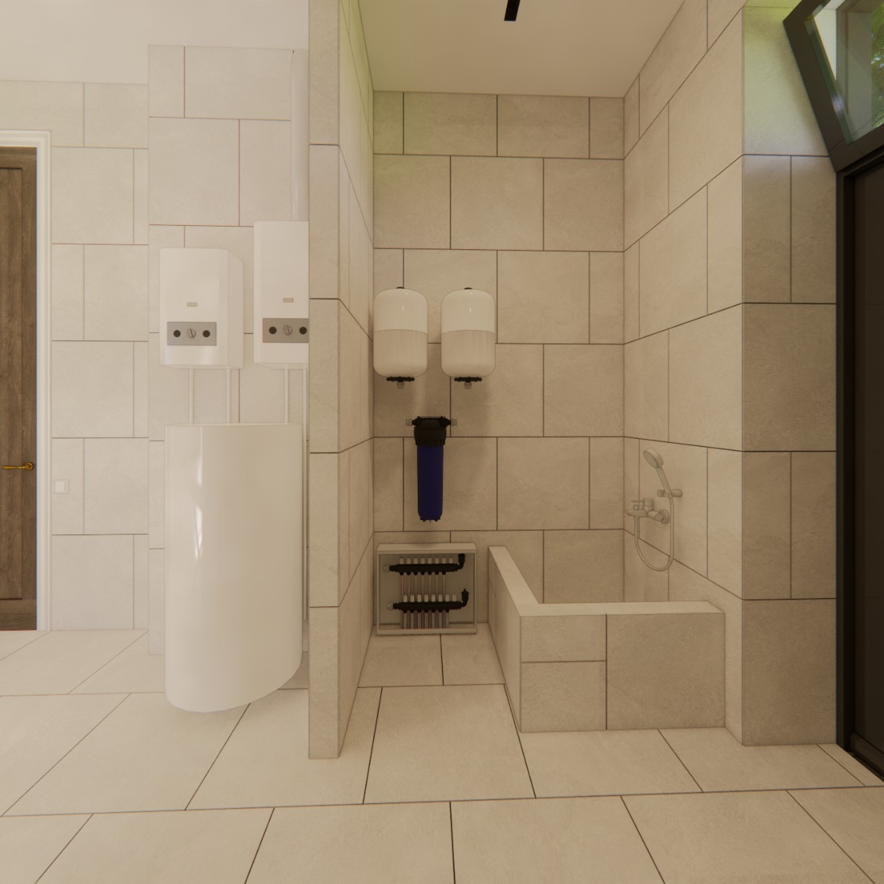 К гостиной примыкают кладовая, санузел и техническое помещение 15.96 м². Все хозяйственные помещения оснащены небольшими окнами, а из технического помещения предусмотрен выход на задний двор.