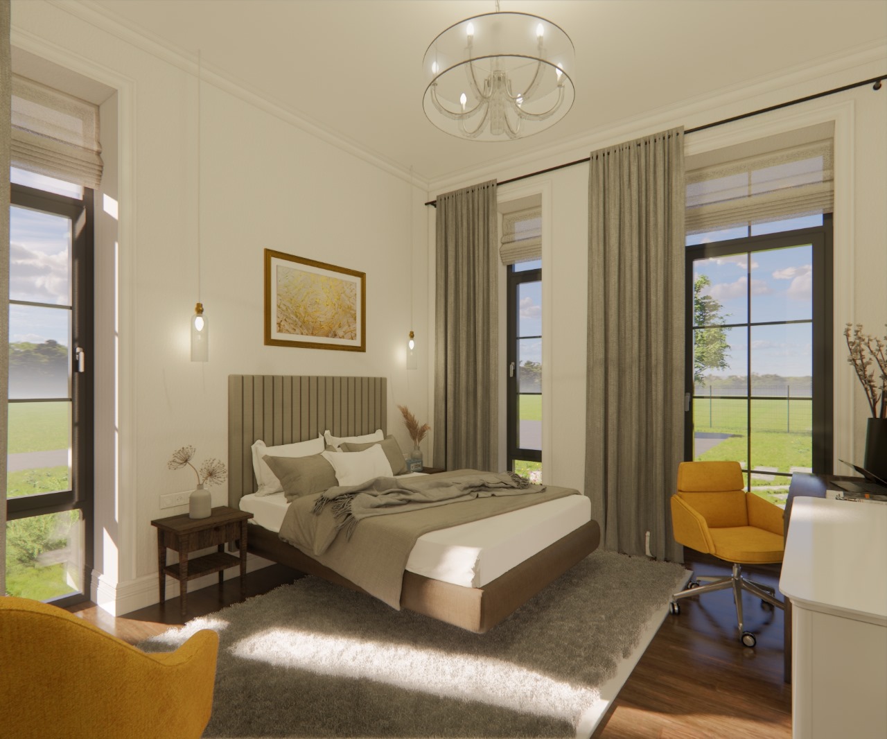 Из холла доступны три спальни площадью 15.75 м², 15.80 м² и 15.90 м². Каждая спальня имеет собственный выход на улицу. Между двумя спальнями устроена ванная комната с отдельным входом из холла и окном, расположенным у ванны.
