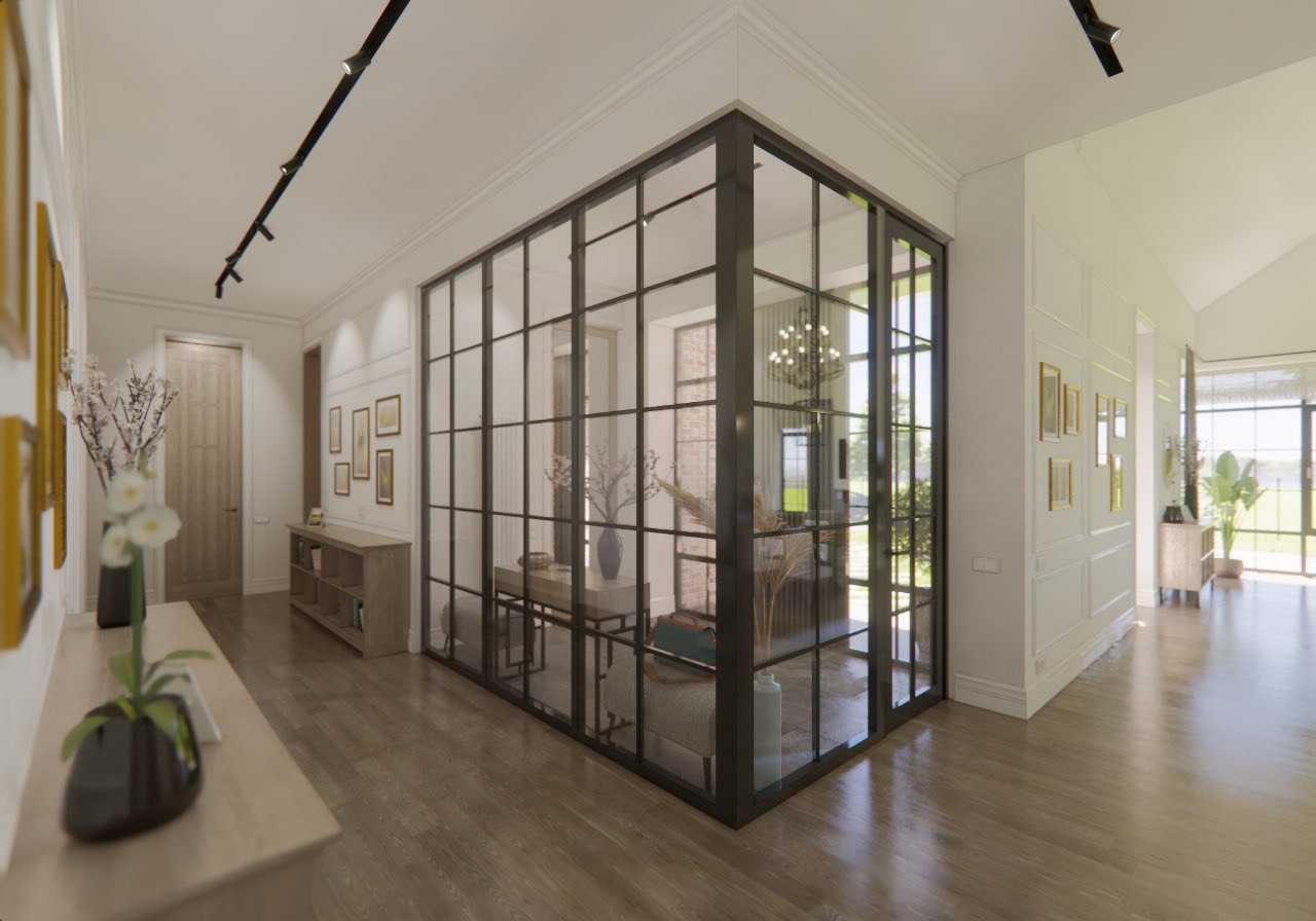 Вход в дом осуществляется через крытое крыльцо площадью 6.98 м², ведущее в тамбур 6.7 м². Справа от тамбура находится гардеробная 7.67 м² с небольшим окном. С левой стороны тамбура расположена дверь в просторный холл 21.99 м², из которого открывается вид на светлую кухню-гостиную 60.07 м² с большим угловым окном и выходом на летнюю террасу. Помимо углового кухня имеет ещё 3 окна.