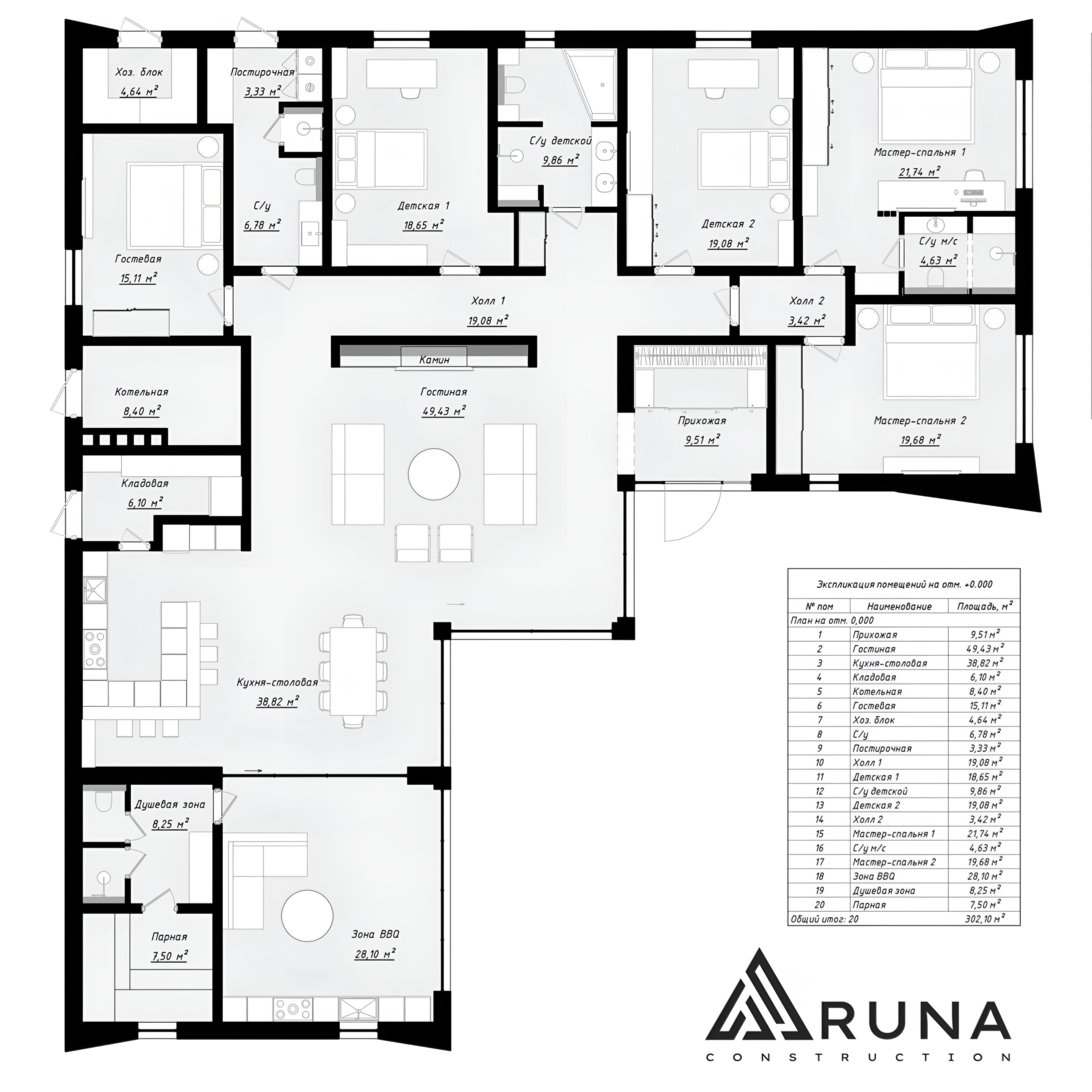 Общая площадь: итого: 302 м².