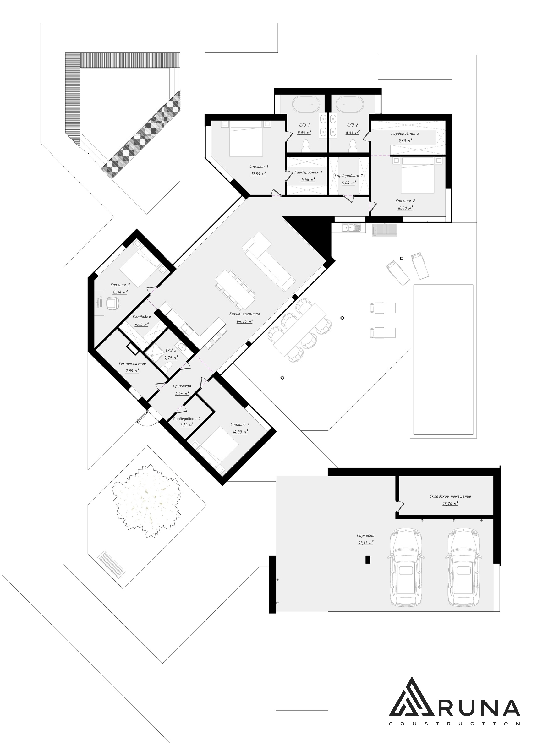 - Крытая Стоянка для Автомобилей: Просторная стоянка площадью 93,13 м² с внутренним складским помещением 13,74 м² для хранения различных вещей.