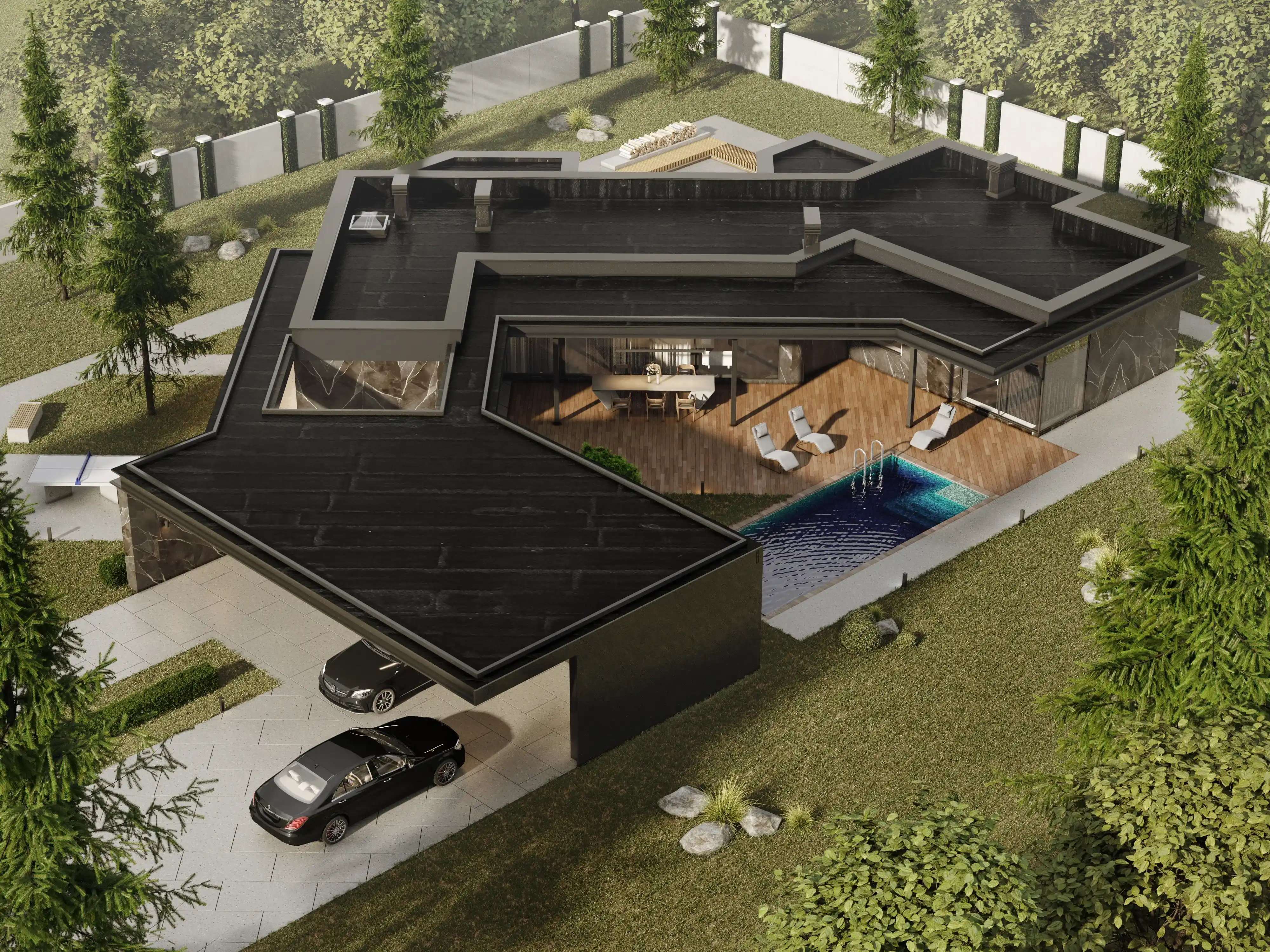 - На террасе расположена обеденная зона и углубленный бассейн, создающий ощущение уединения и комфорта на открытом воздухе.
