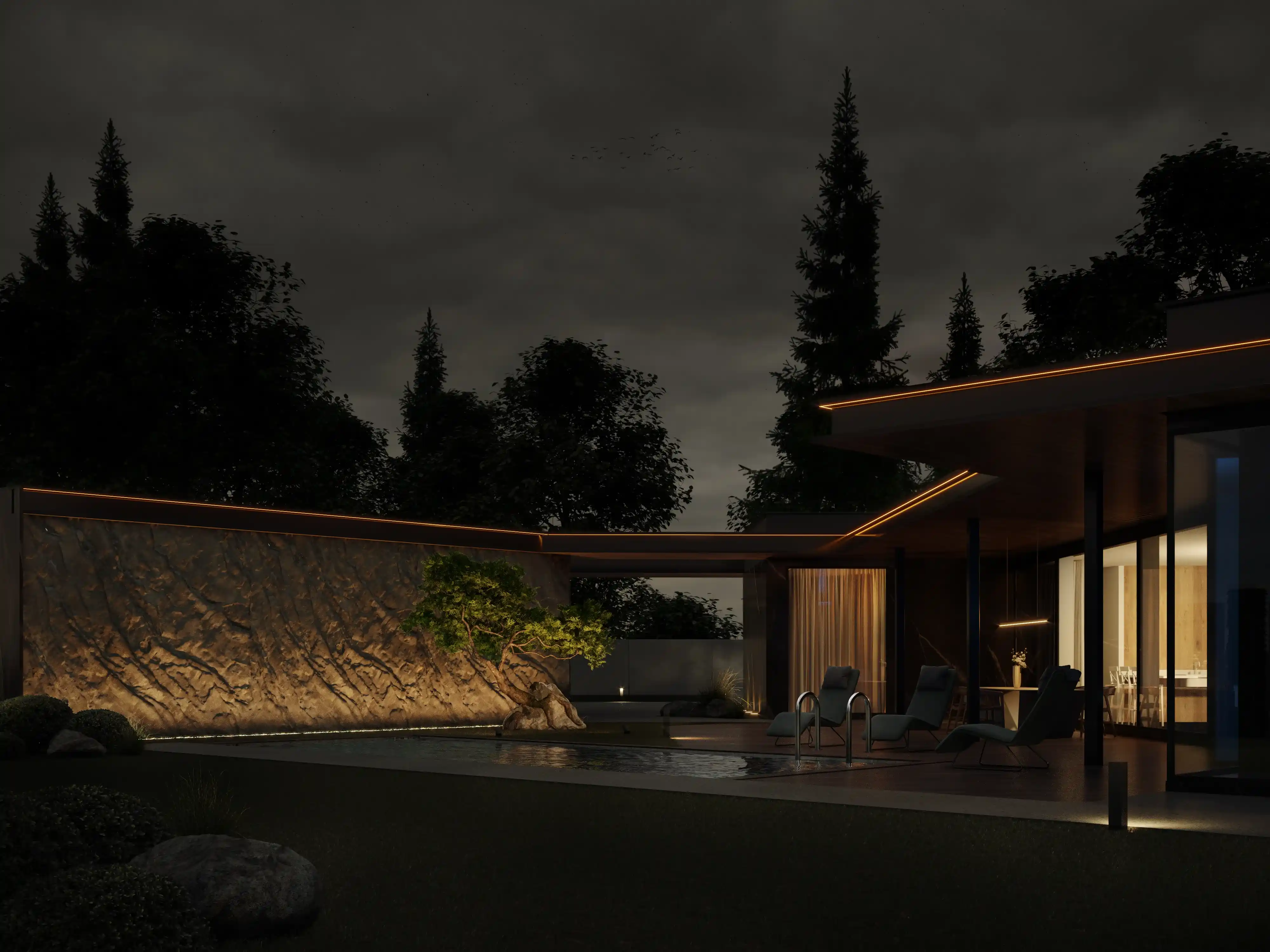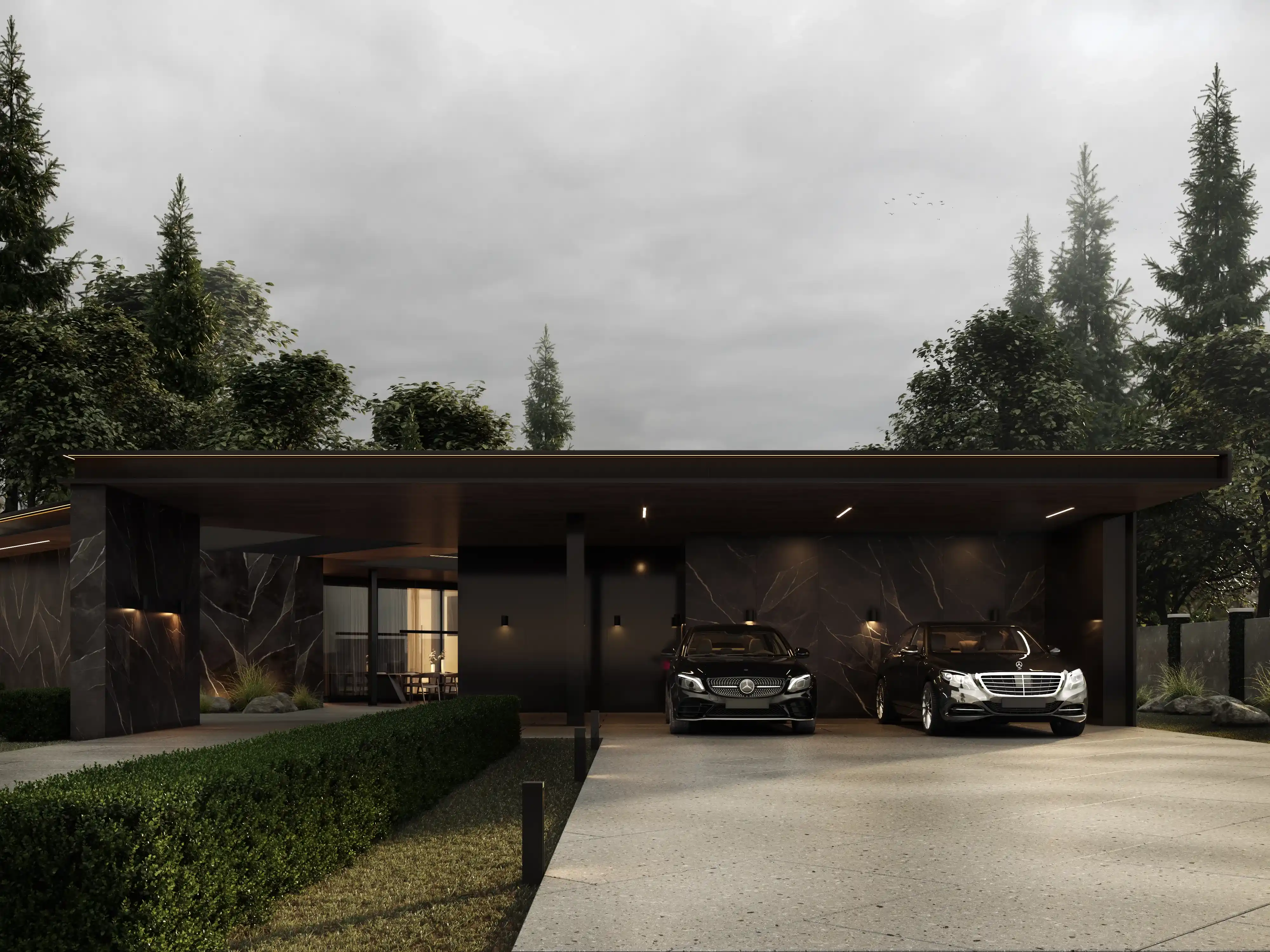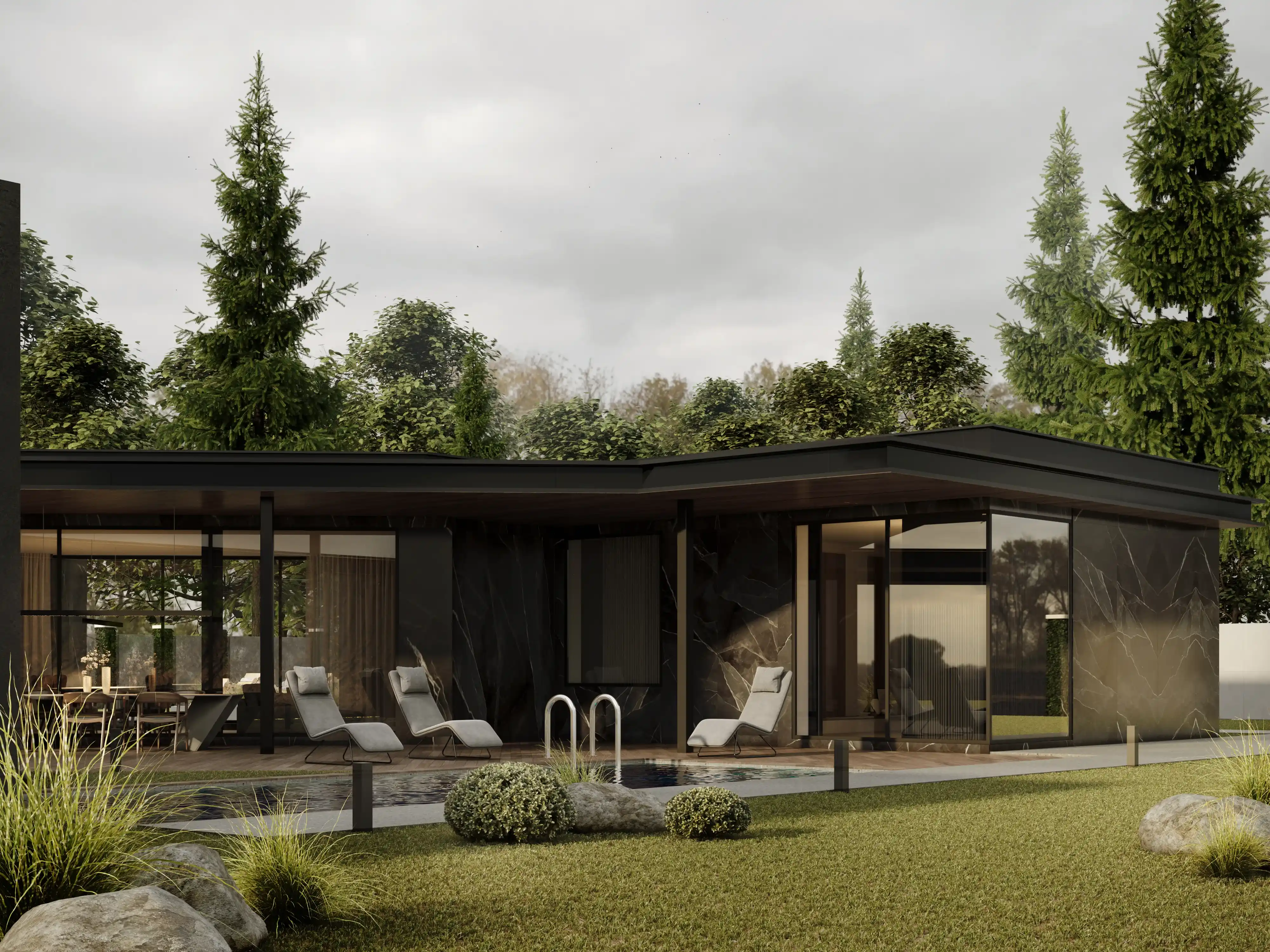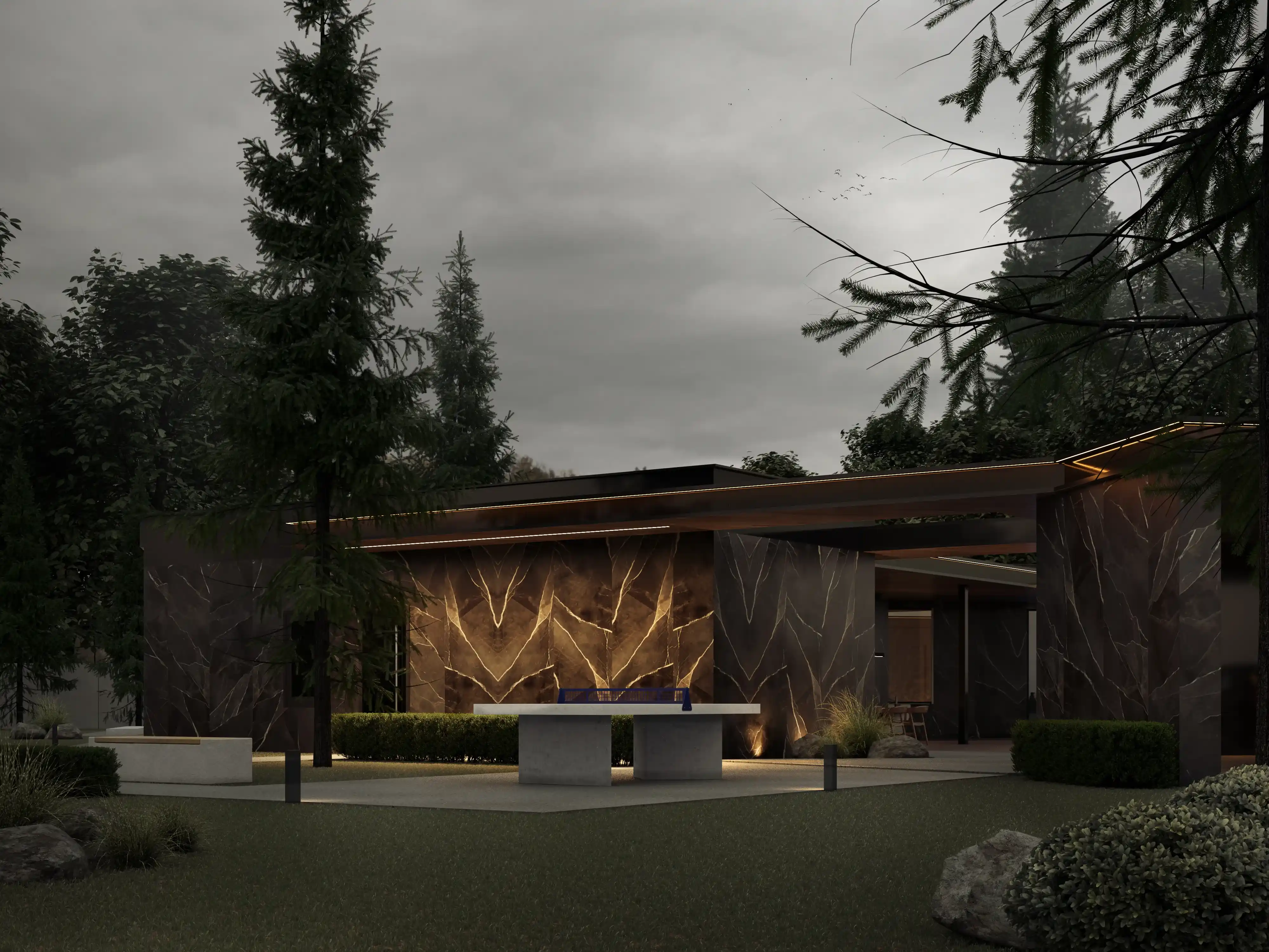 Внешние Стены: облицованы темным и светлым деревом, а также темным камнем или материалом под камень, создавая визуальный контраст и добавляя тепла.