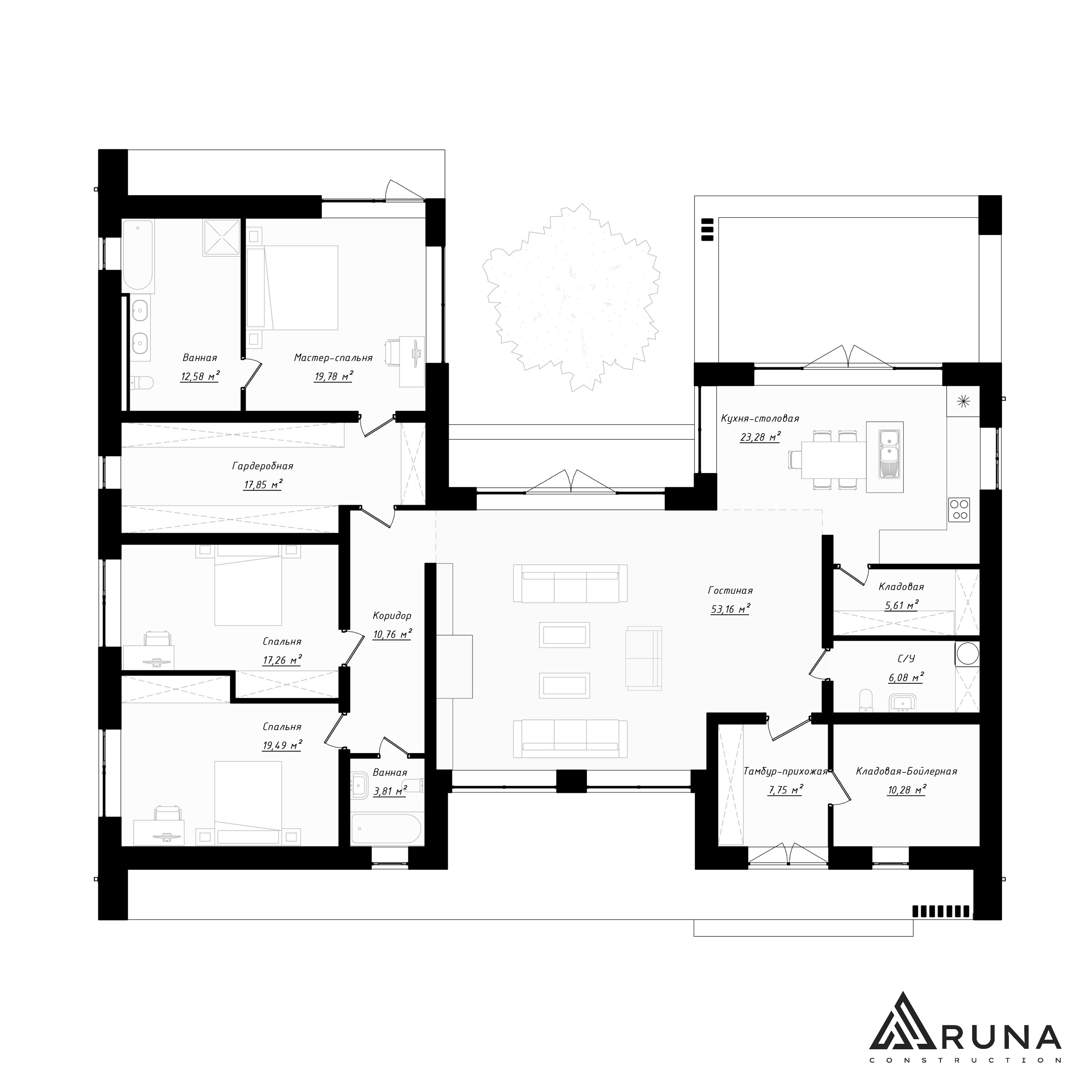 При входе в тамбур-прихожую (7,75 м²) основная дверь ведет в просторную гостиную (53,16 м²). К тамбуру примыкает кладовая-бойлерная (10,28 м²), а к гостиной — санузел, кладовая и кухня-столовая (23,28 м²), имеющая выход на террасу.