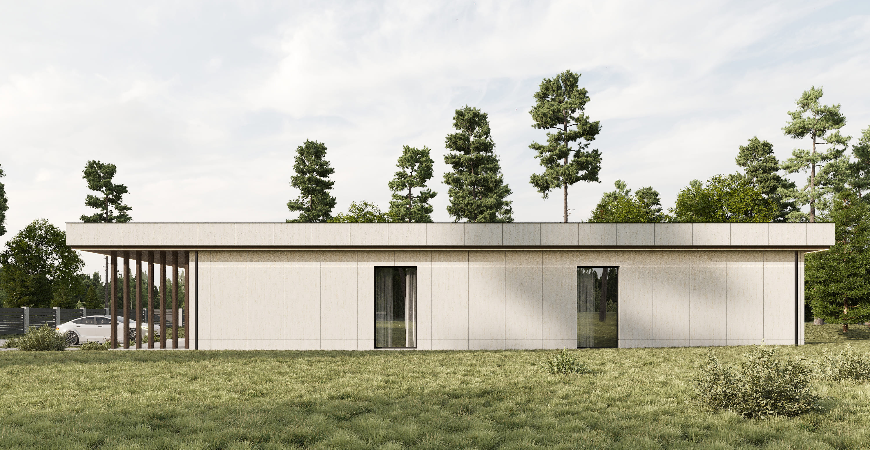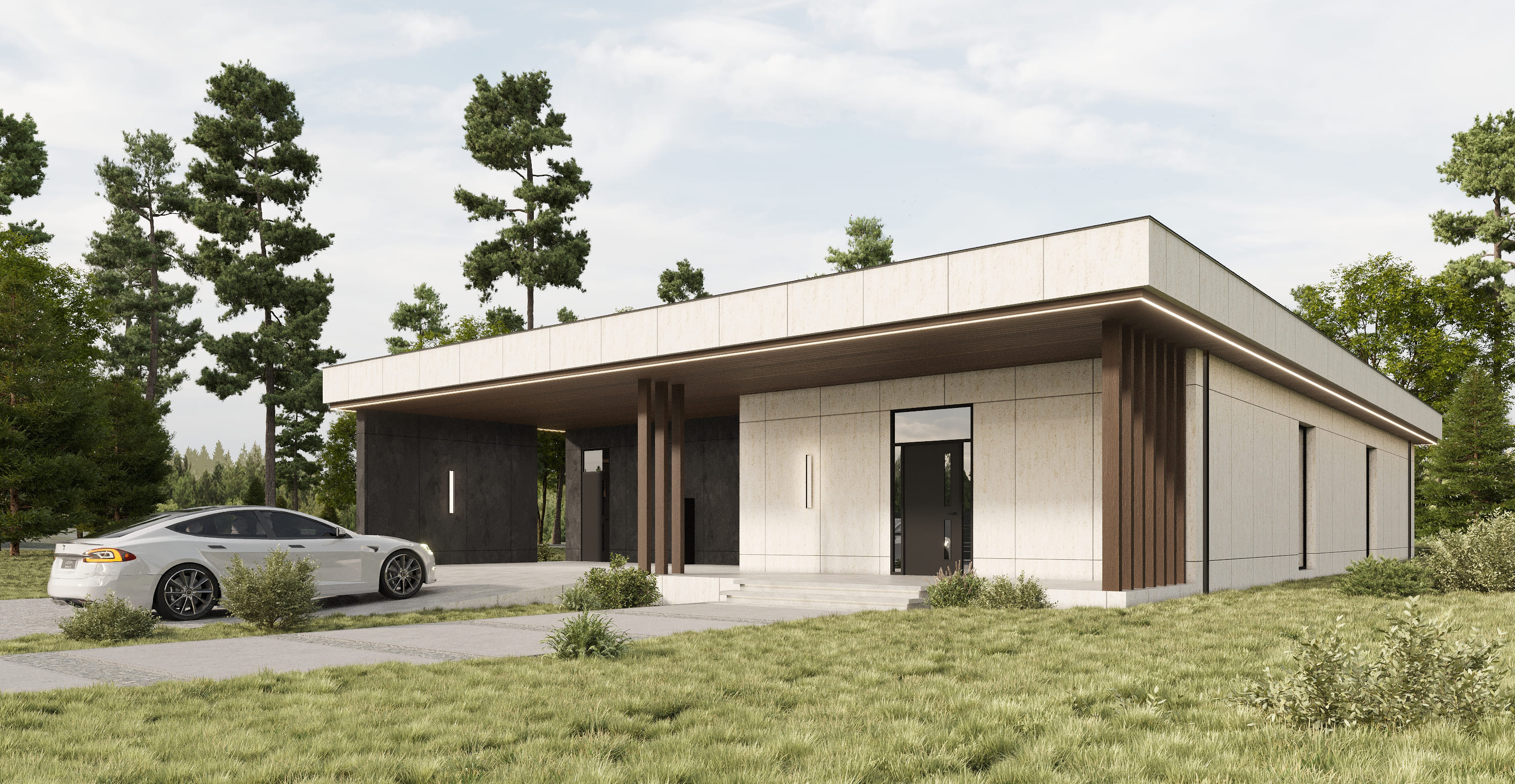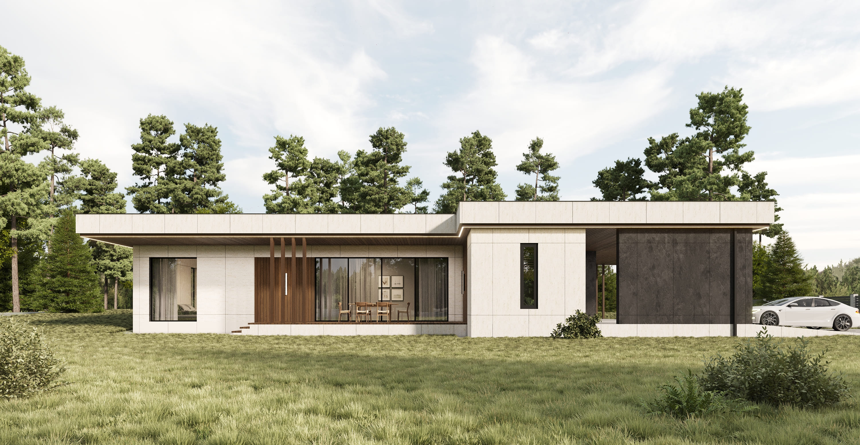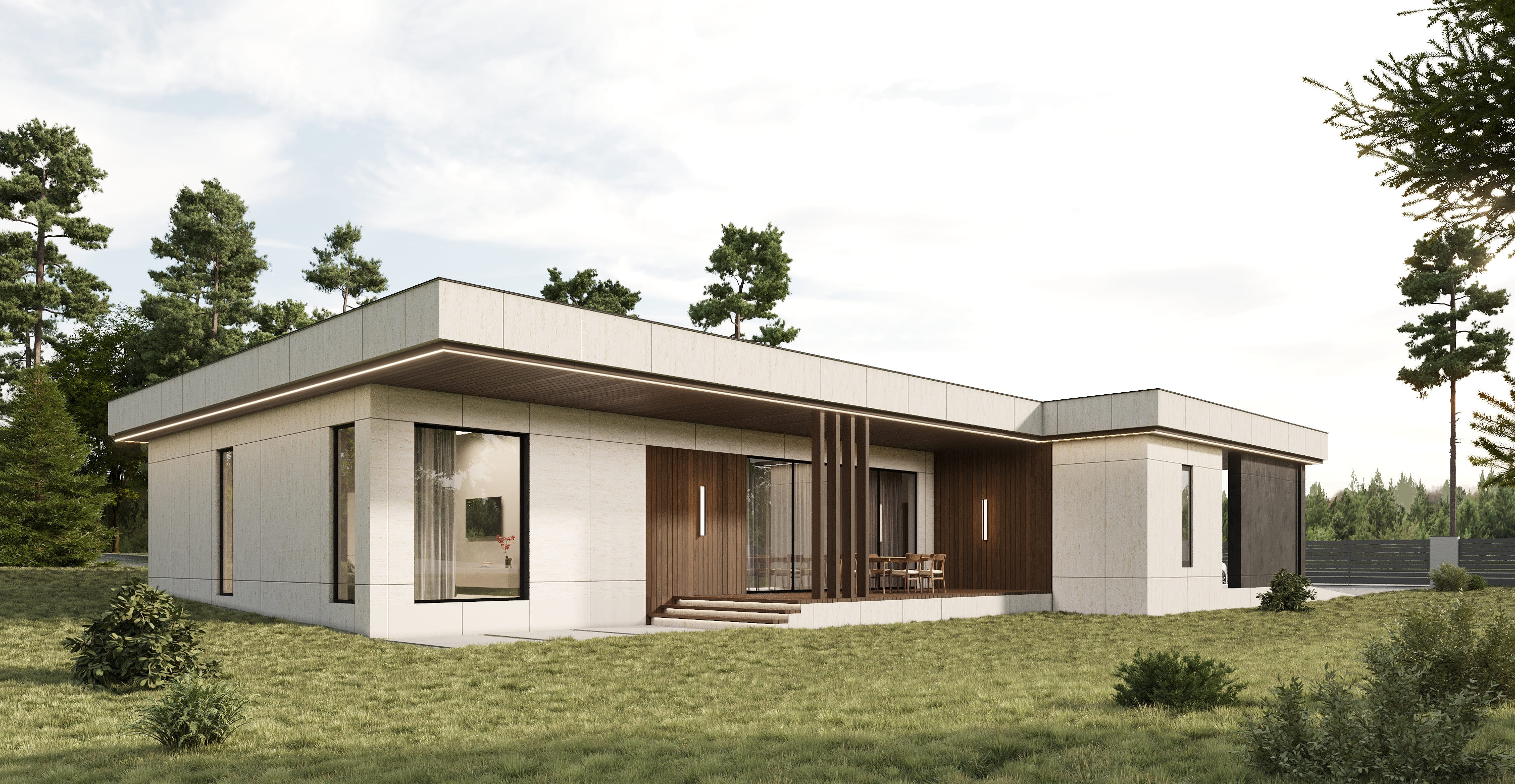 Проект одногоэтажного дома с плоской кровлей, расположенного на неровном участке, представляет собой идеальное сочетание элегантности, минимализма и гармонии с природным окружением. Чистые линии и геометрия формы дома отражают современный стиль, создавая ощущение открытости и простора.