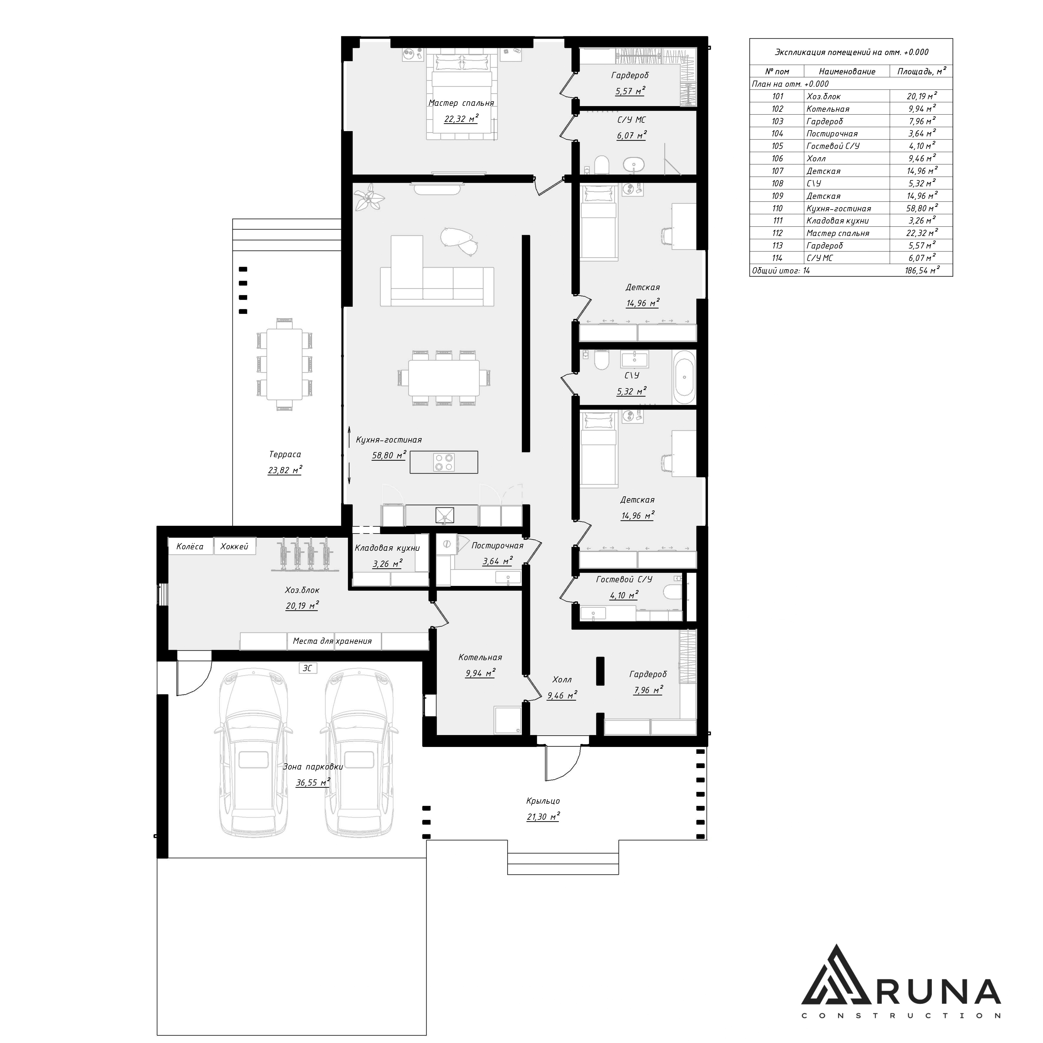 Также предусмотрены крытая терраса и дополнительные зоны хранения. Общая площадь дома делает его идеальным для комфортного проживания семьи.