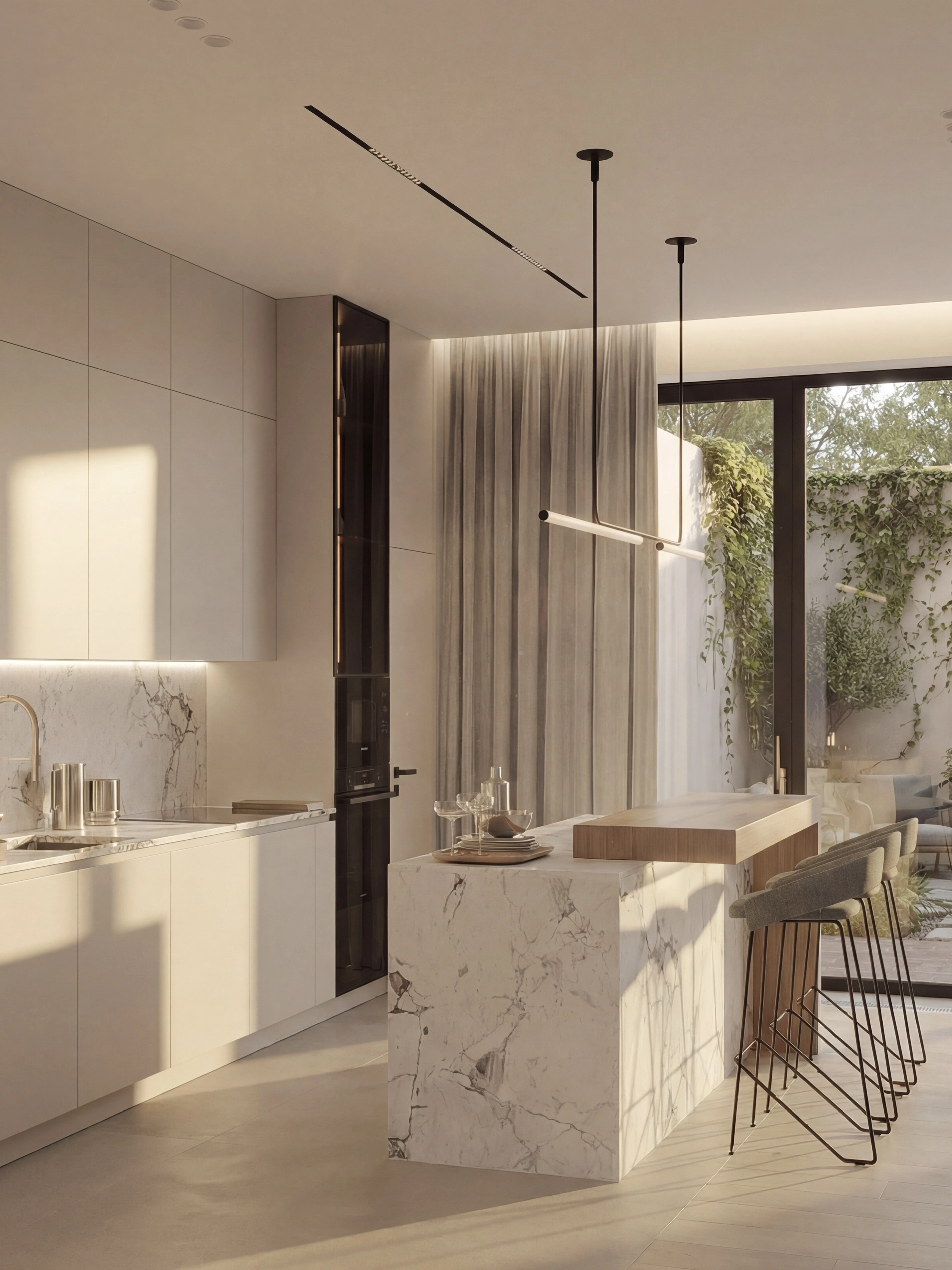 - Просторную кухню-гостиную с обеденной зоной, которая объединяет пространство и создает атмосферу уюта.