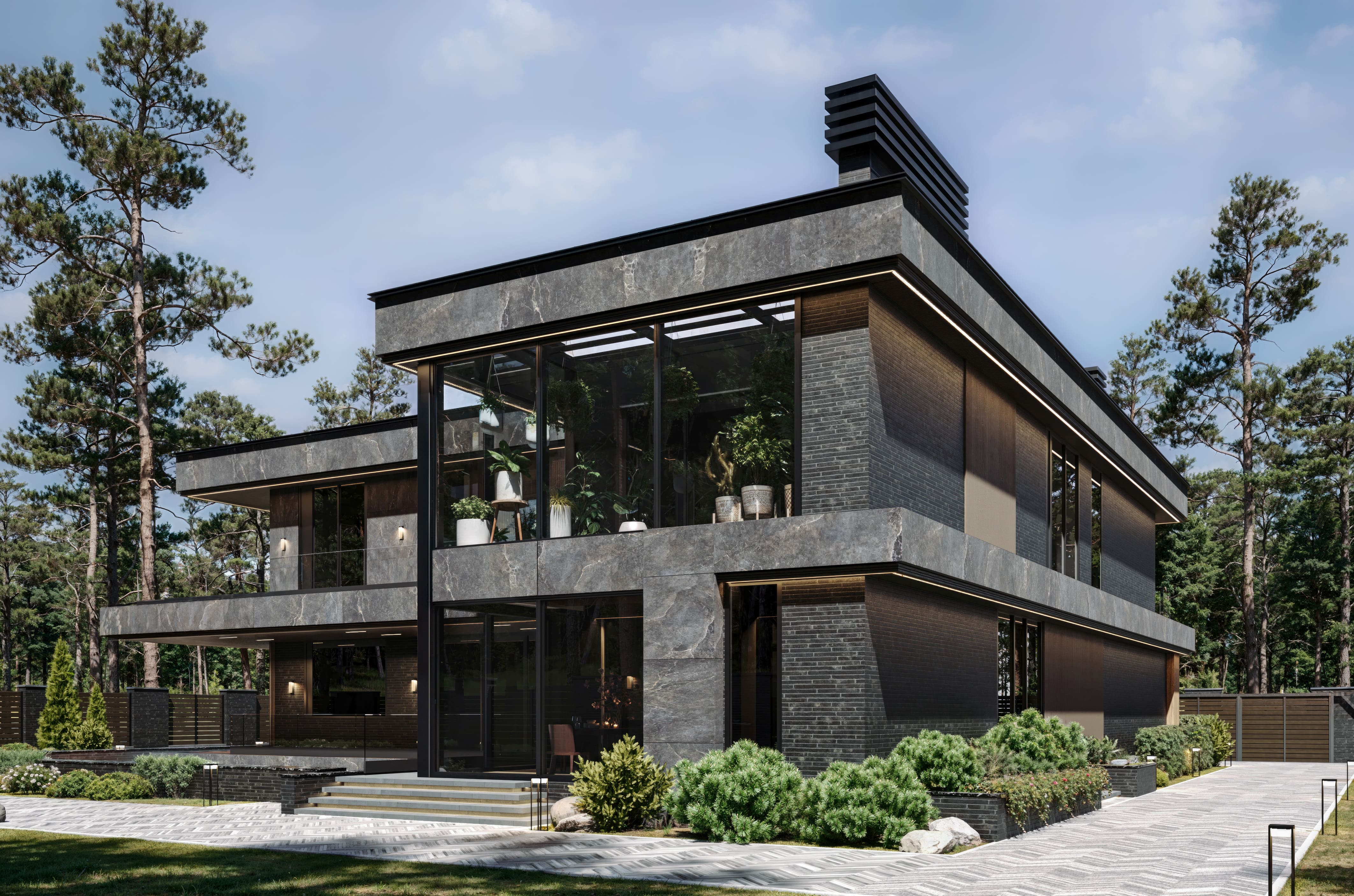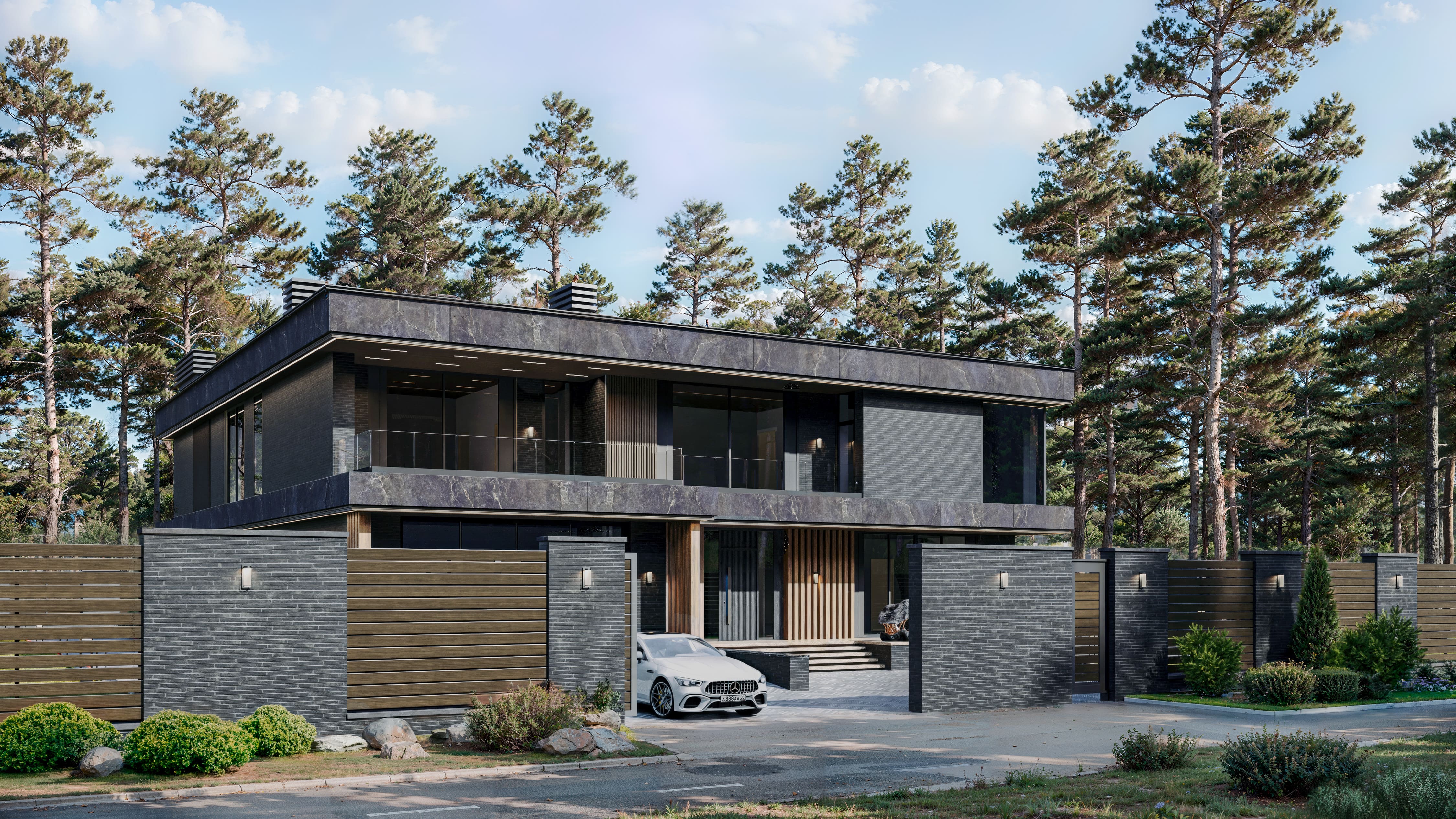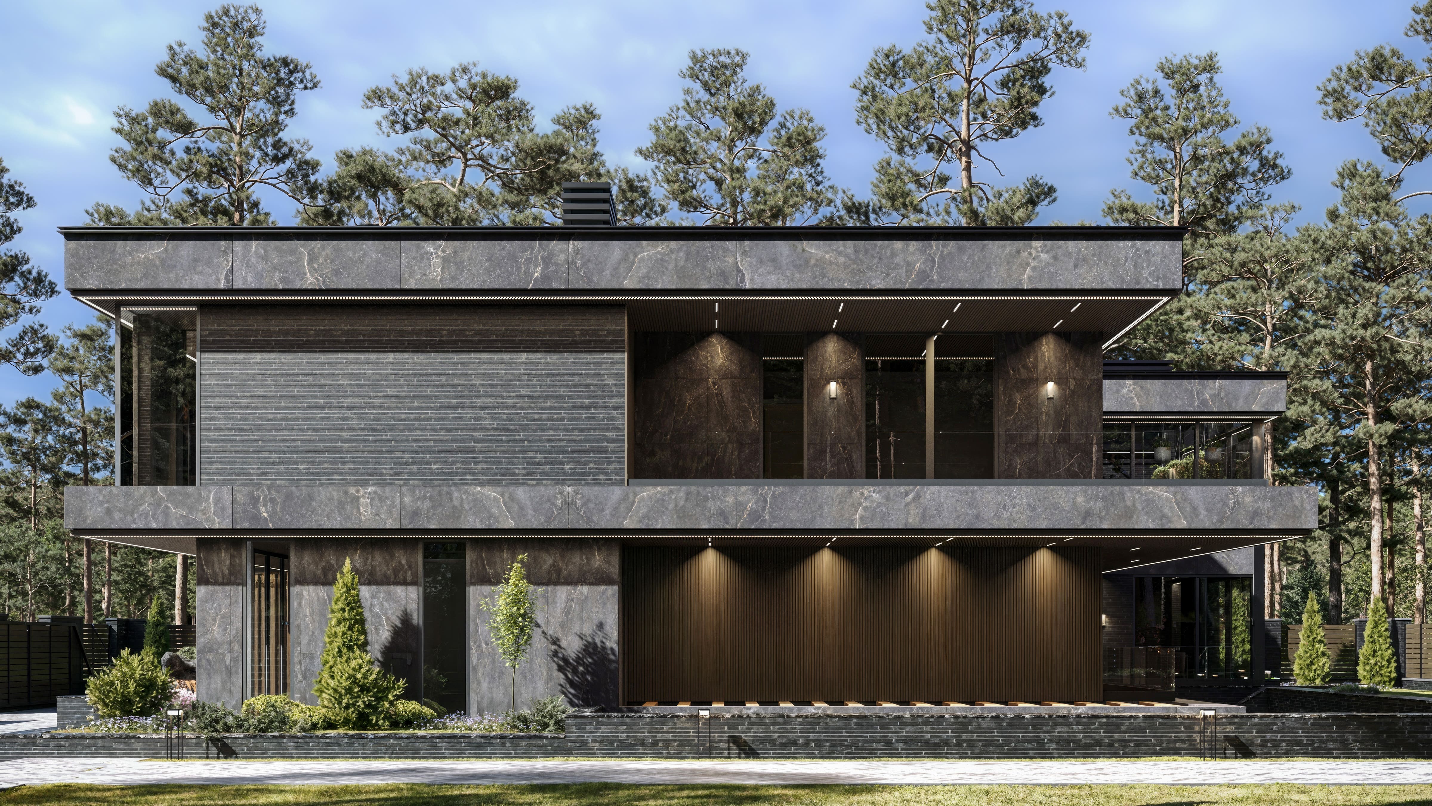 Фасад выполнен в элегантной комбинации итальянского керамогранита, дерева, клинкерной плитки и стекла, что подчеркивает стильную сдержанность здания. Четкие геометрические формы, плоская кровля и выразительные горизонтальные линии создают архитектурную гармонию.