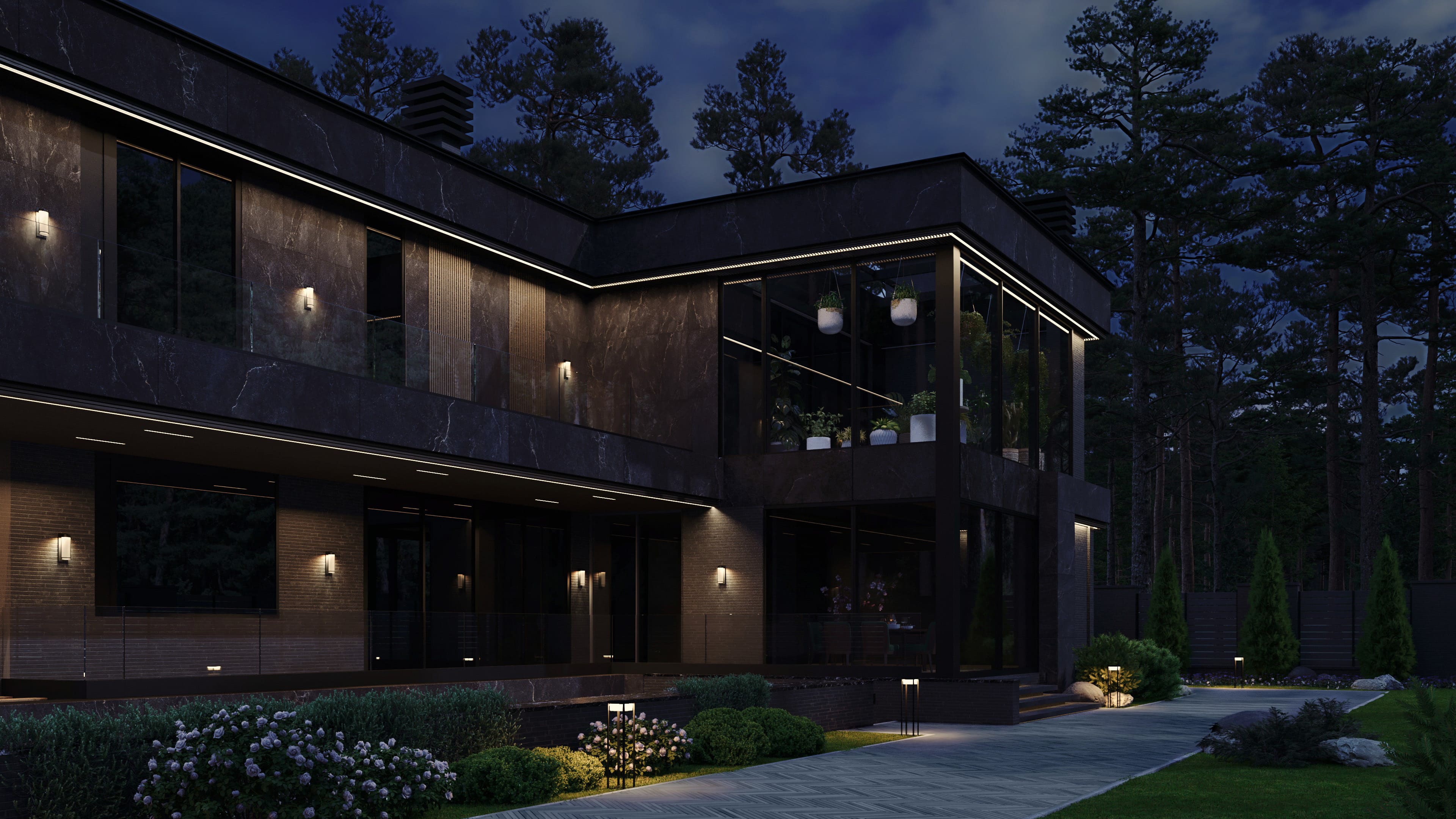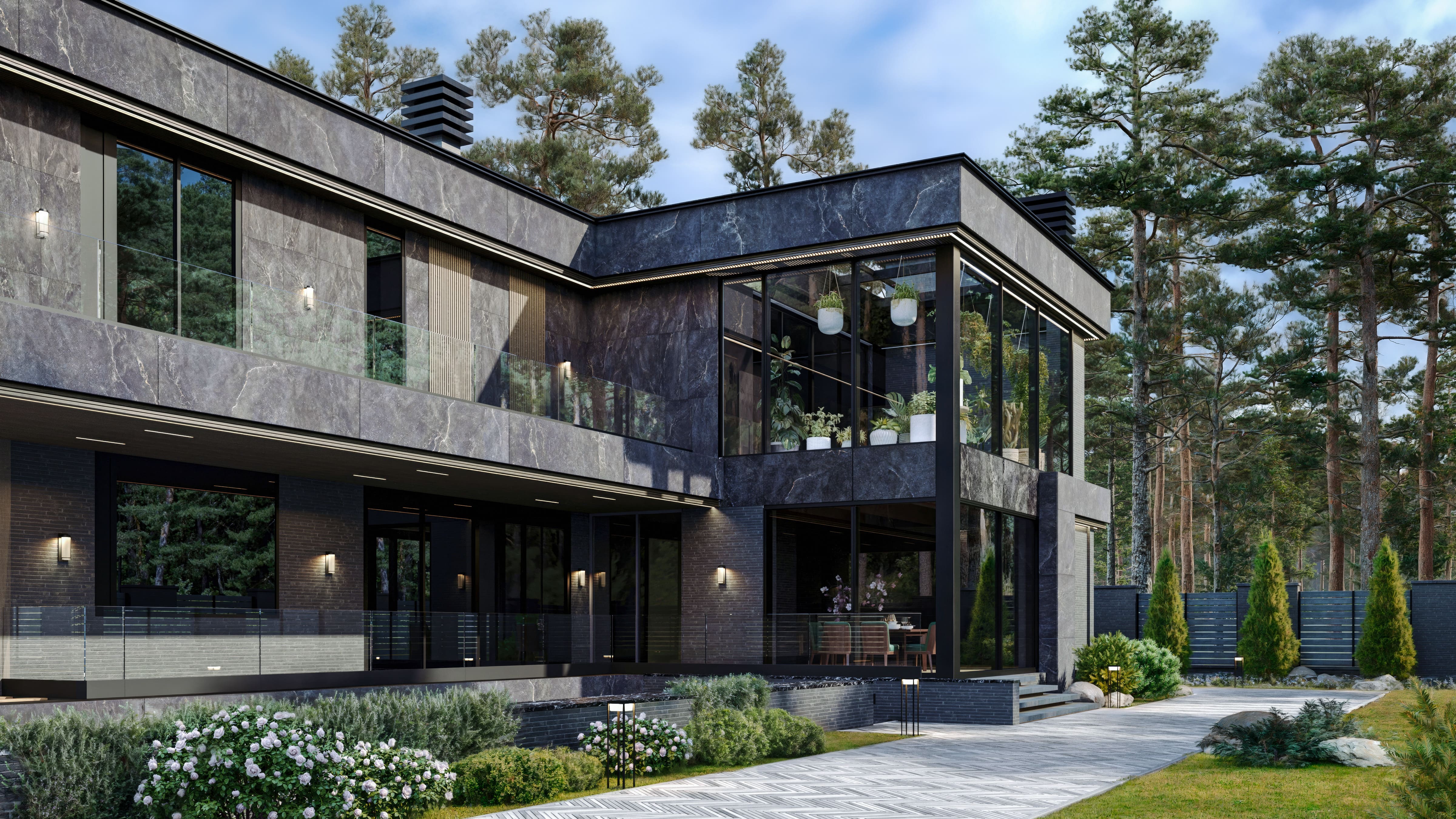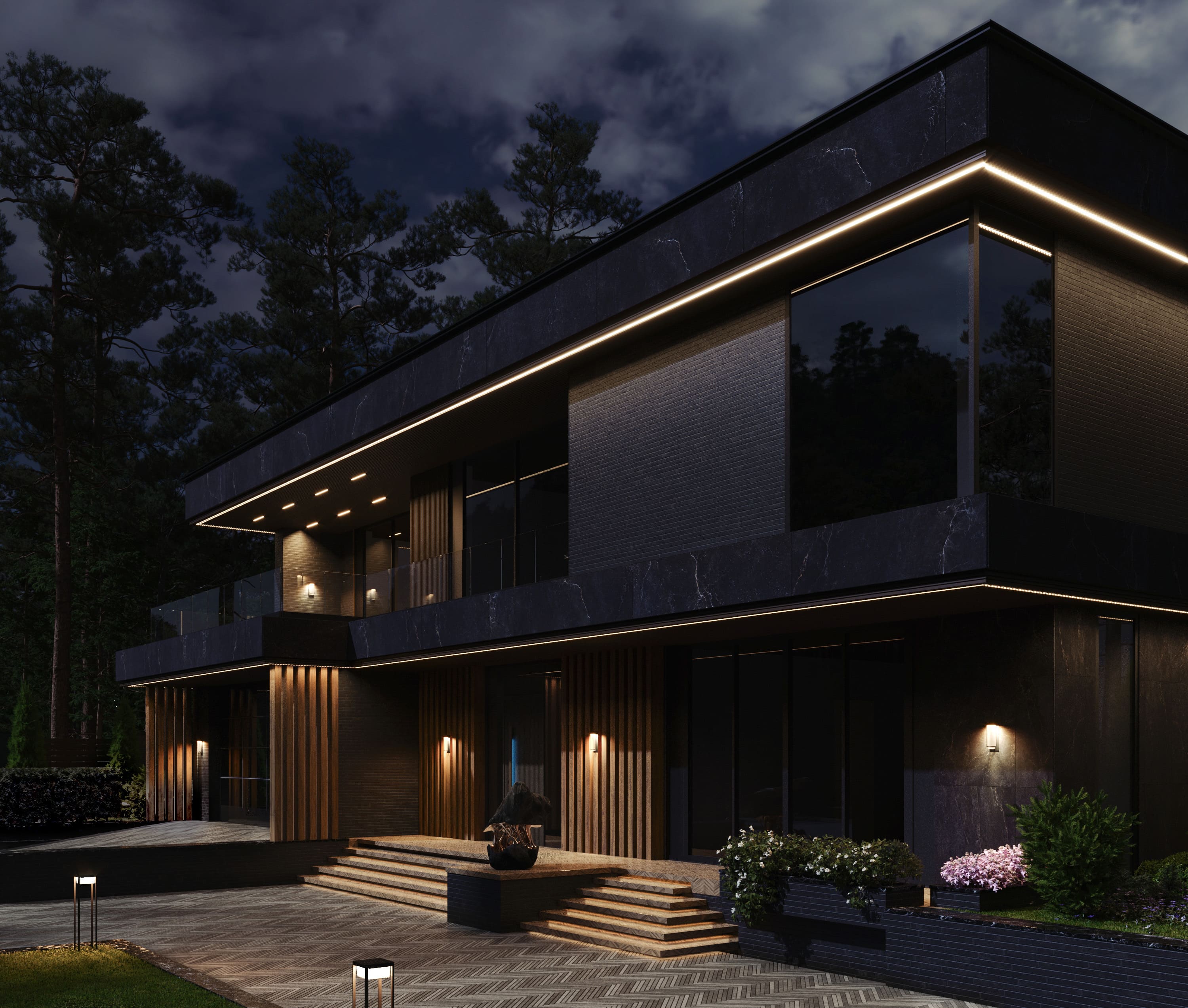 Фасад выполнен в элегантной комбинации итальянского керамогранита, дерева, клинкерной плитки и стекла, что подчеркивает стильную сдержанность здания. Четкие геометрические формы, плоская кровля и выразительные горизонтальные линии создают архитектурную гармонию.