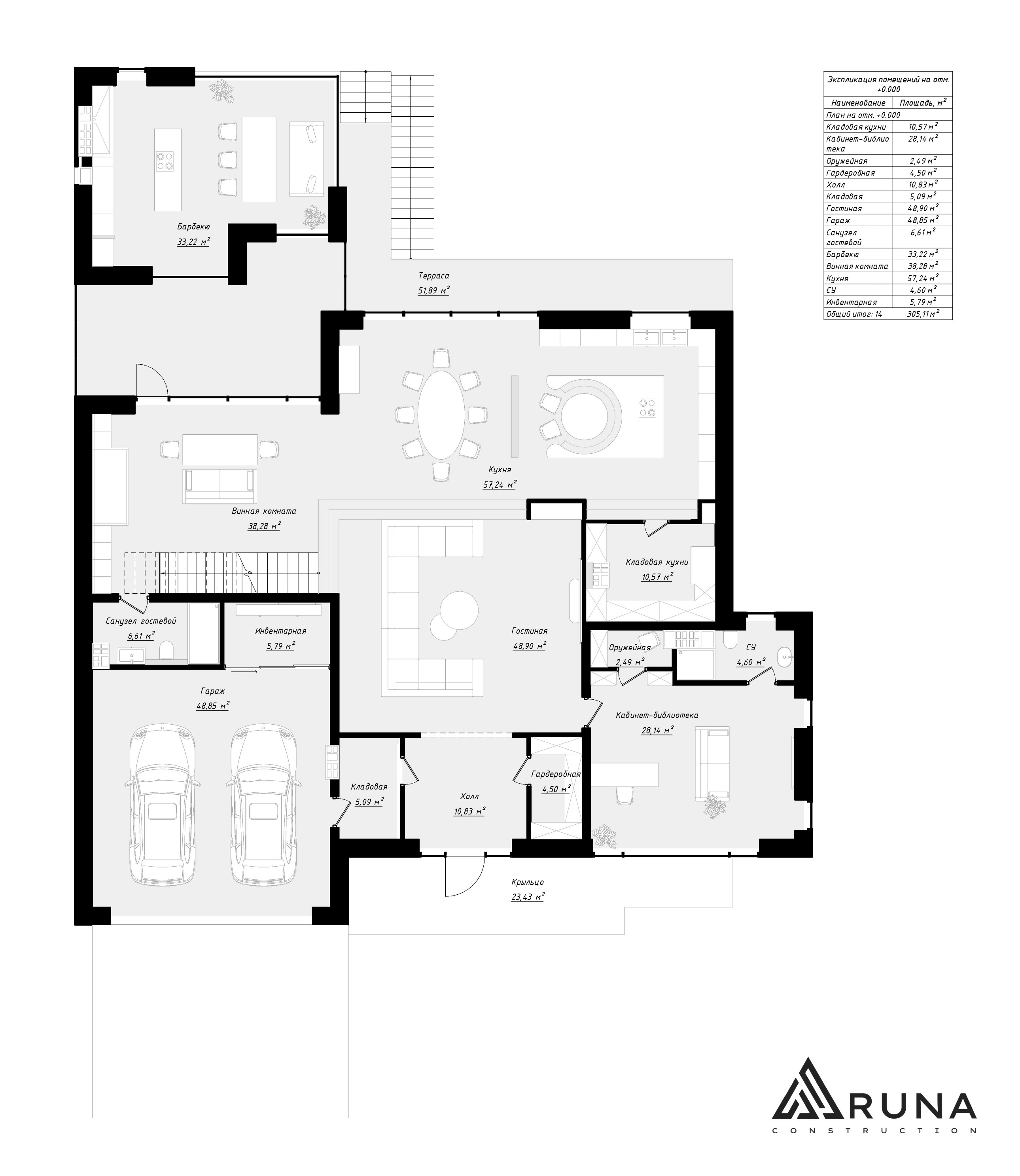 Просторное центральное помещение, которое связывает все основные зоны дома. Оно позволяет создать ощущение открытого пространства и в то же время является удобным переходом между комнатами.