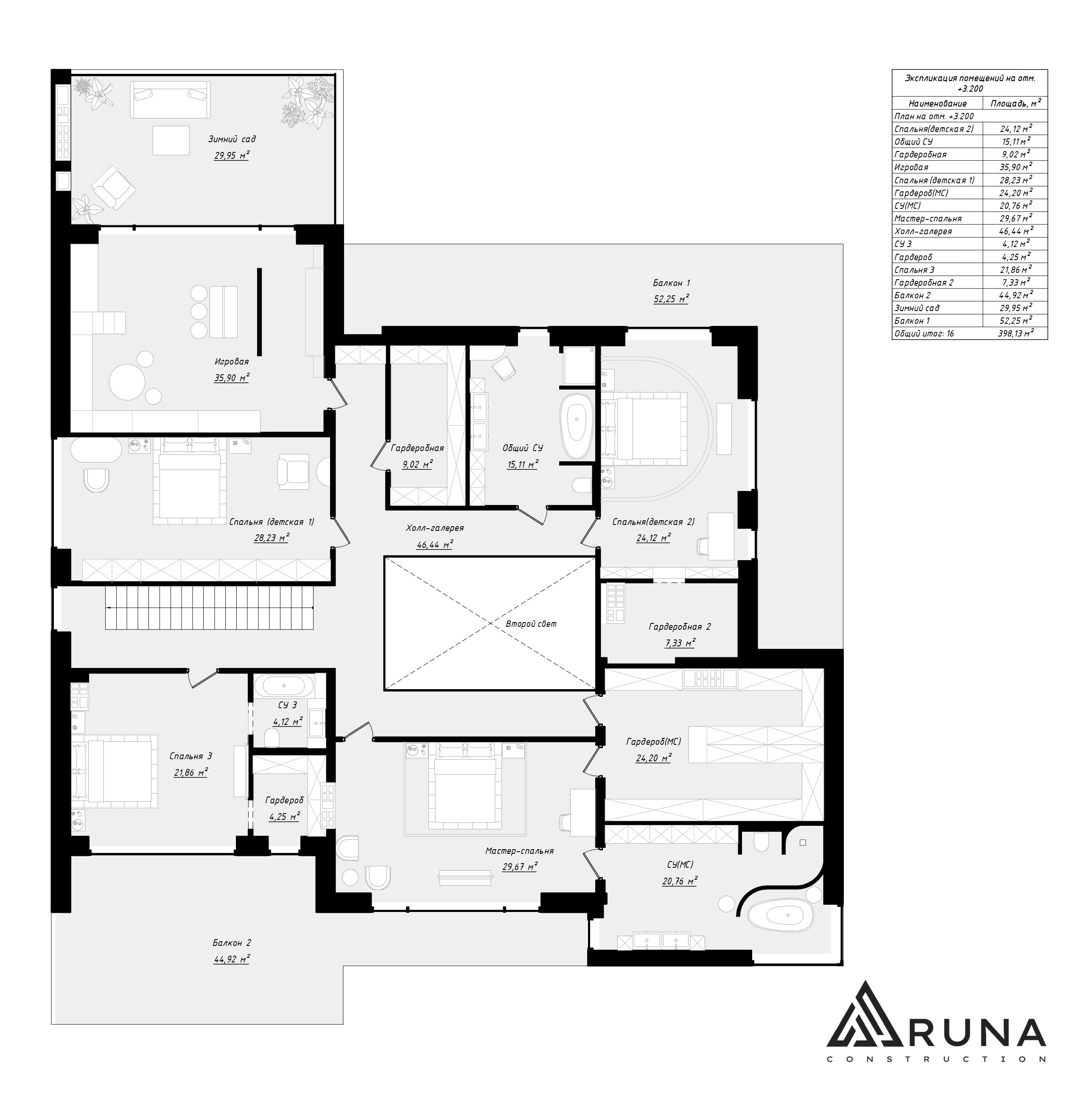 - Мастер-спальня (30 м²) – просторная спальня с личной гардеробной и ванной комнатой.