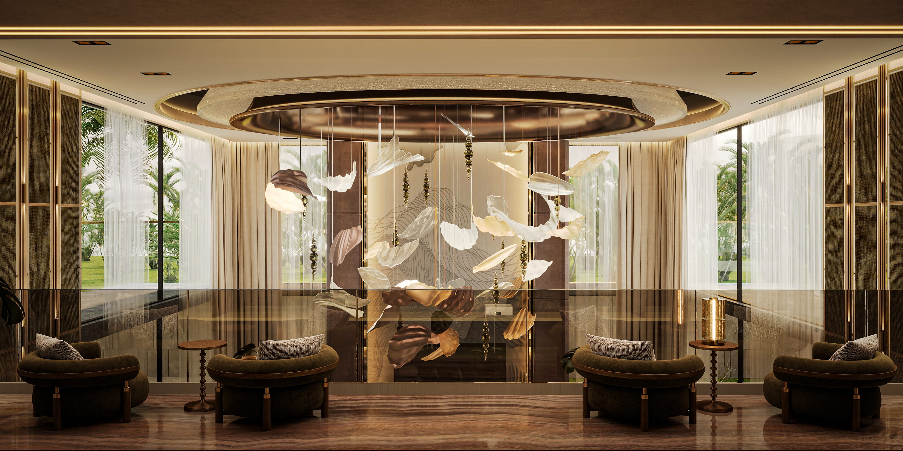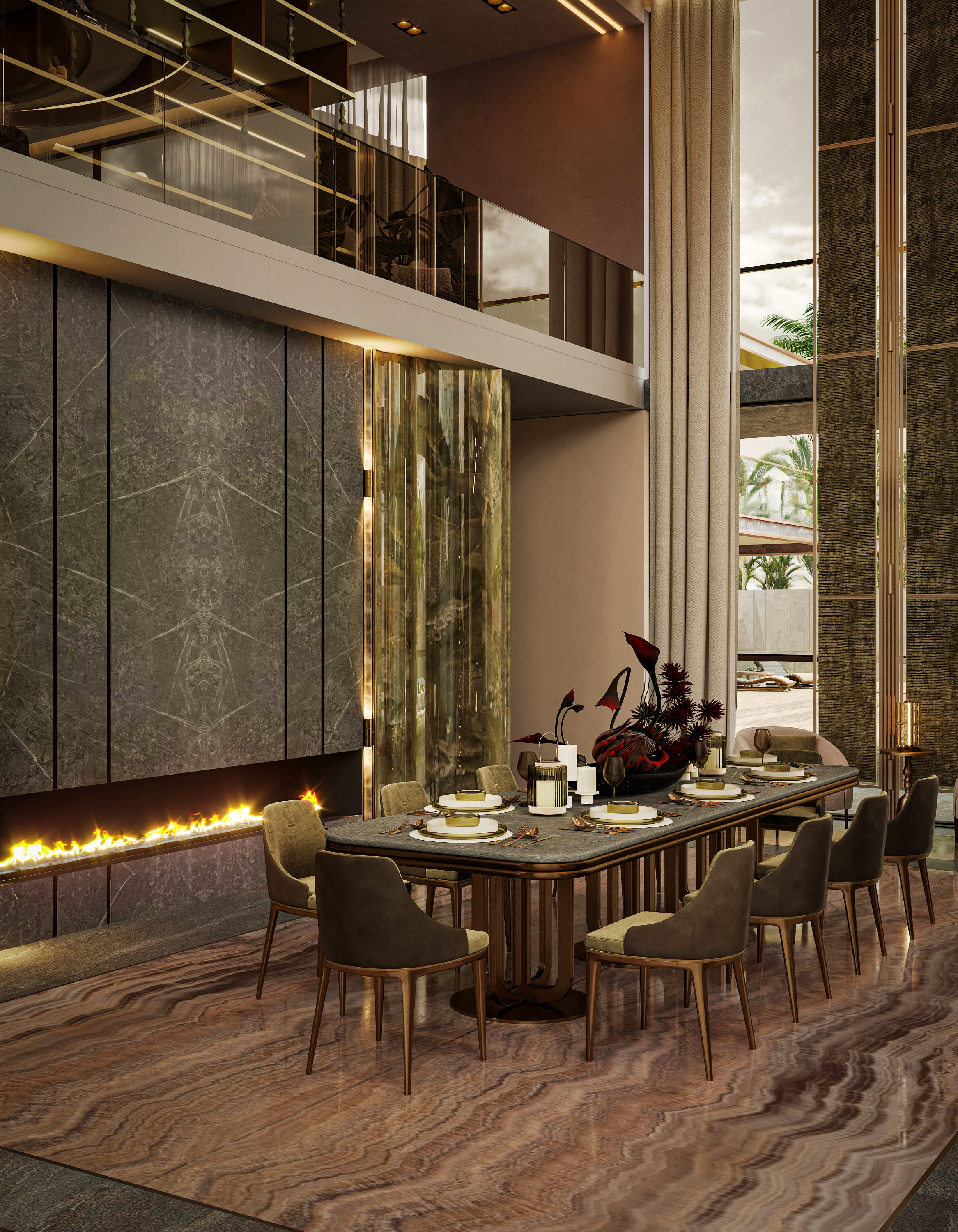 Эксклюзивная двухэтажная вилла площадью 1200 м². Хай-тек с элементами природной гармонии На фасаде белая штукатурка с медными акцентами, а также керамогранит различных оттенков Главный акцент — редкий красный оникс, на входе впечатляющая инсталляция – скульптурная скала с ниспадающим фонтаном